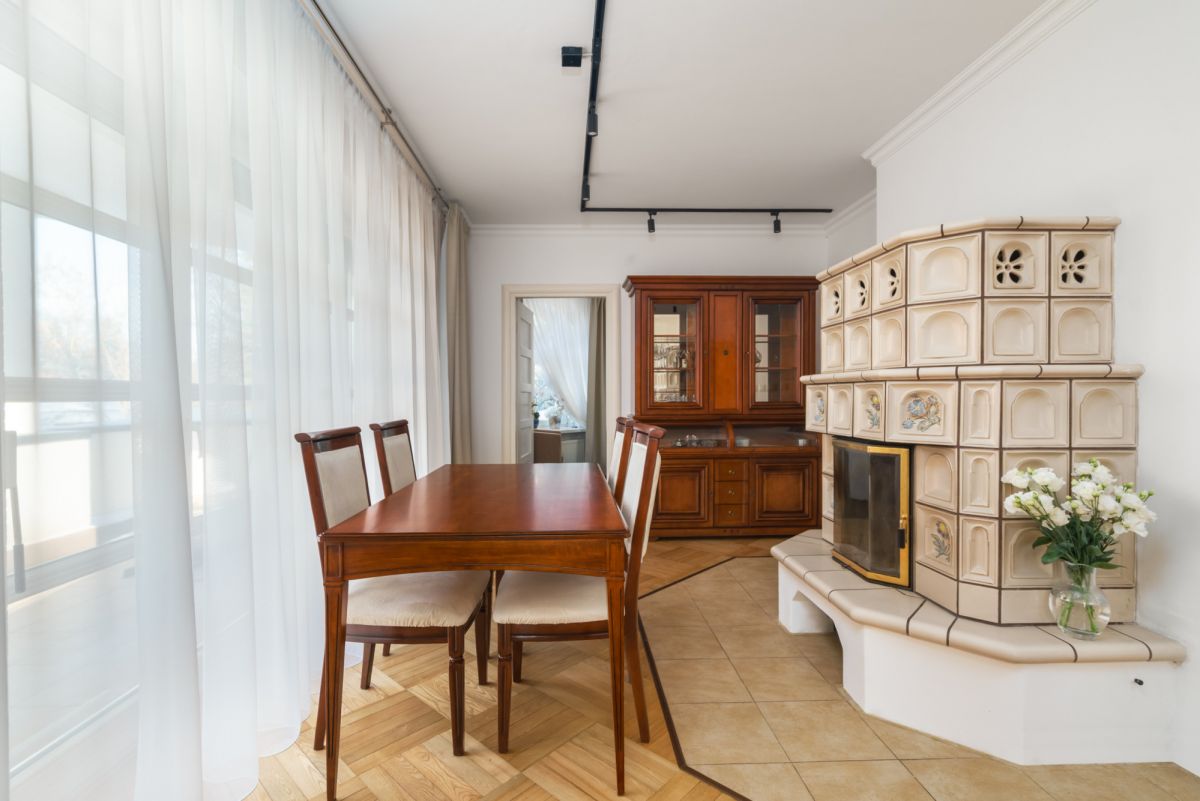 Podłogi: gres i parkiet jesionowy, schody dębowe, kominek, rolety antywłamaniowe.