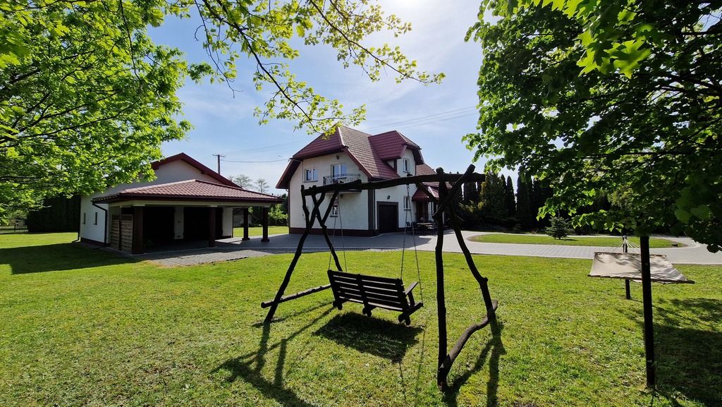 Oprócz domu na działce posadowiony jest osobny budynek z garażem dwustanowiskowym , z wiatą na 2 auta i dodatkowym pomieszczeniem, które może być wykorzystane jako warsztat, spiżarka, magazyn itp.