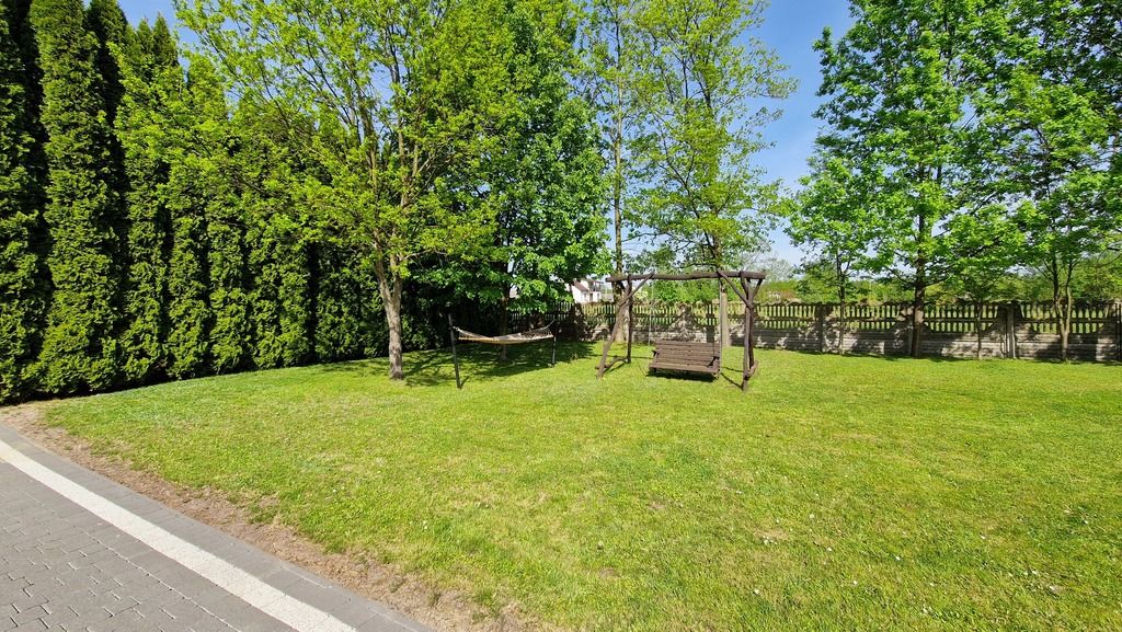Teren działki jest bardzo zadbany, obsadzony wysokimi tujami, przed domem i garażem położona kostka. Wydzielone miejsce na wypoczynek, hamak, ławeczka.