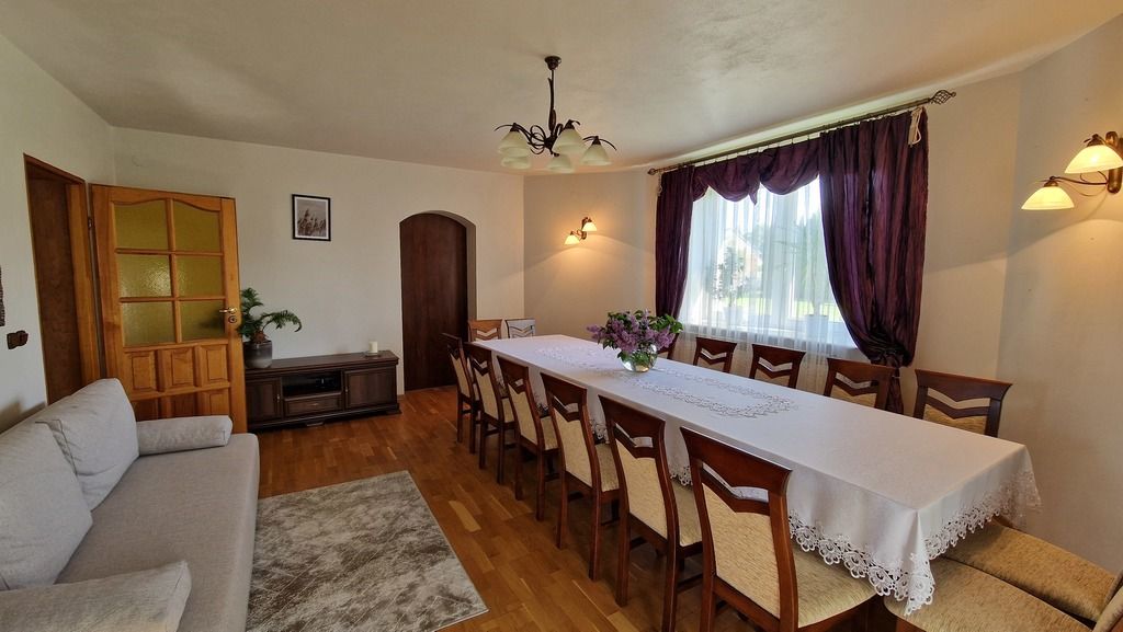 Z tyłu domu, bardzo duża przestrzeń pozwala na organizowanie rodzinnych spotkań, wspólnych gier, zabaw zachowując przy tym całkowitą prywatność.