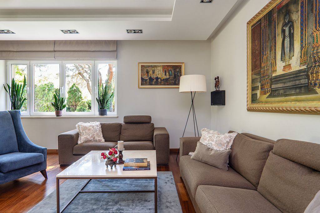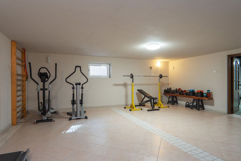 - Piwnica: siłownia, sauna, barek, piwniczka na wino, druga kuchnia, pralnia, kotłownia.