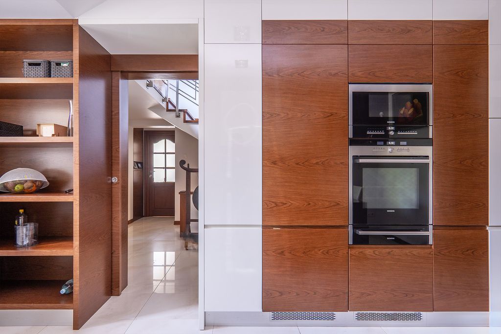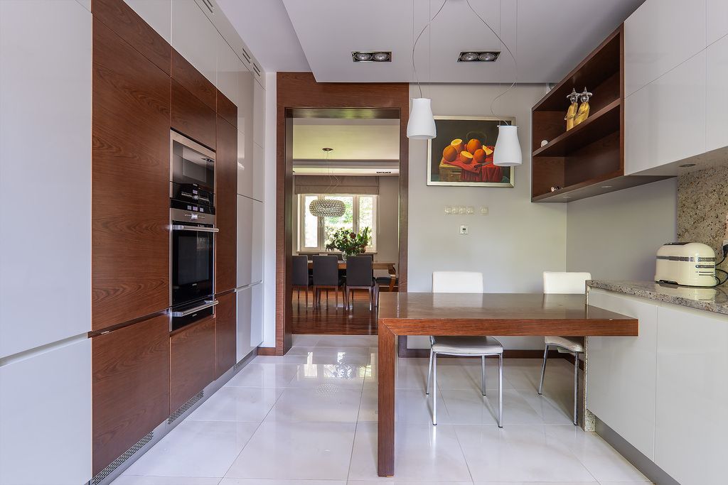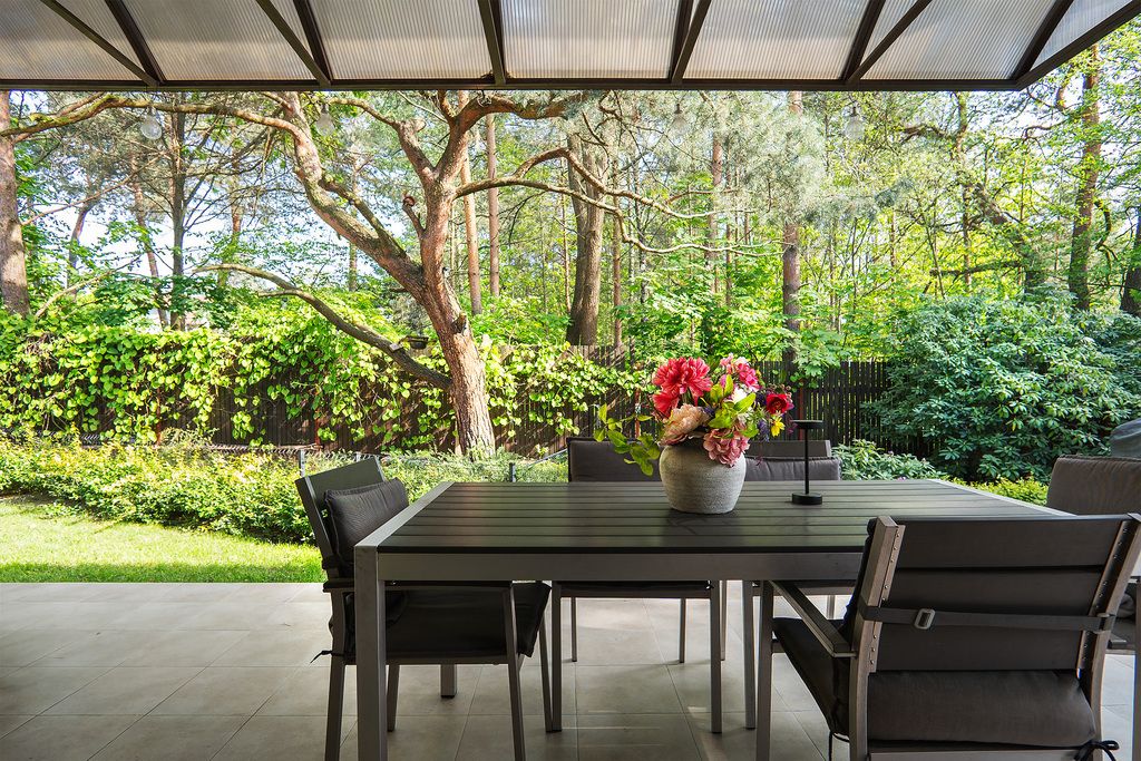 Układ: - Parter: salon z kominkiem i wyjściem na taras, jadalnia, kuchnia z AGD Siemens i lodówką Liebherr, gabinet (lub pokój seniora), WC, główna sypialnia z garderobą i pokojem kąpielowym.