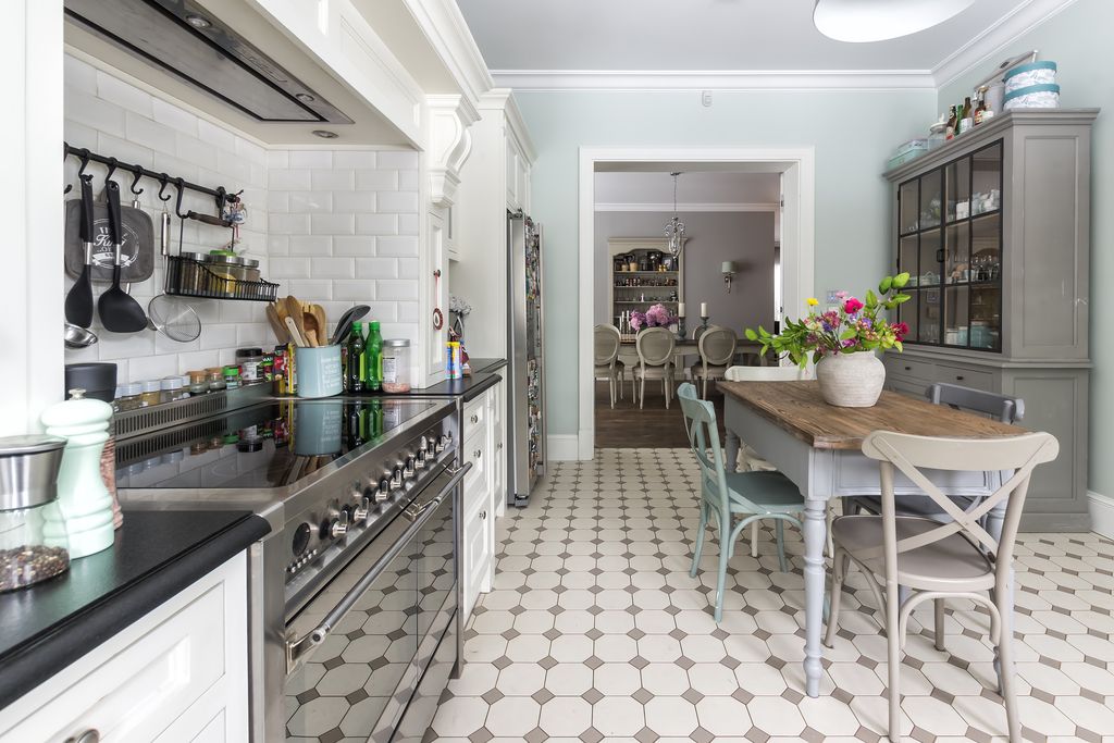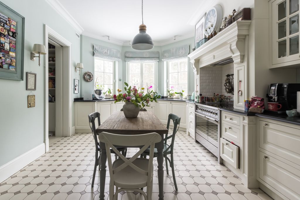 Kuchnia z wyposażeniem SMEG, granitowe blaty, bielone meble, cementowe płytki