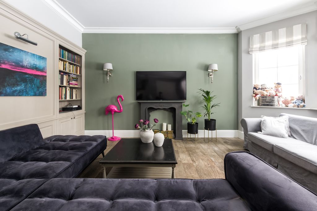 - Salon z kominkiem i wyjściem na taras i ogród: 33,08 m²