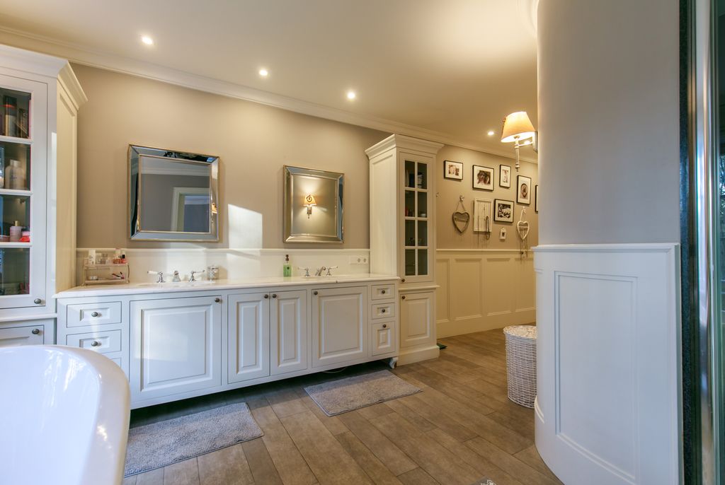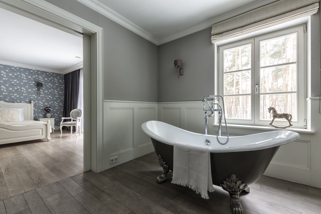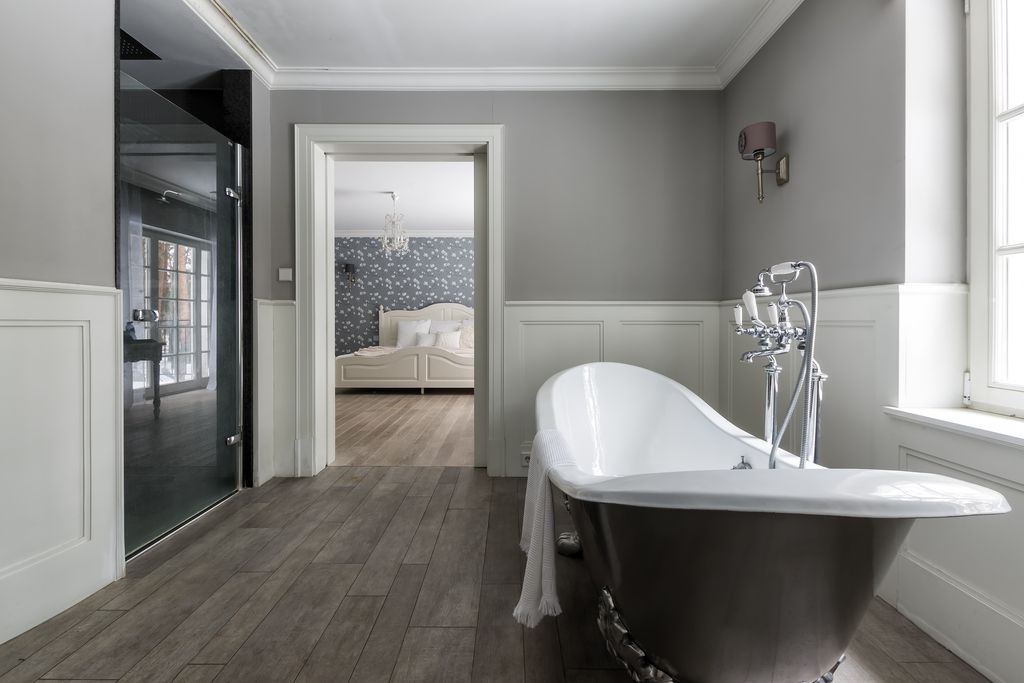 - Sypialnia 4 (główna): 26,52 m² z prywatnym tarasem, pokojem kąpielowym (wanna wolnostojąca na lwich łapach) i garderobą