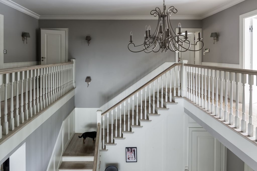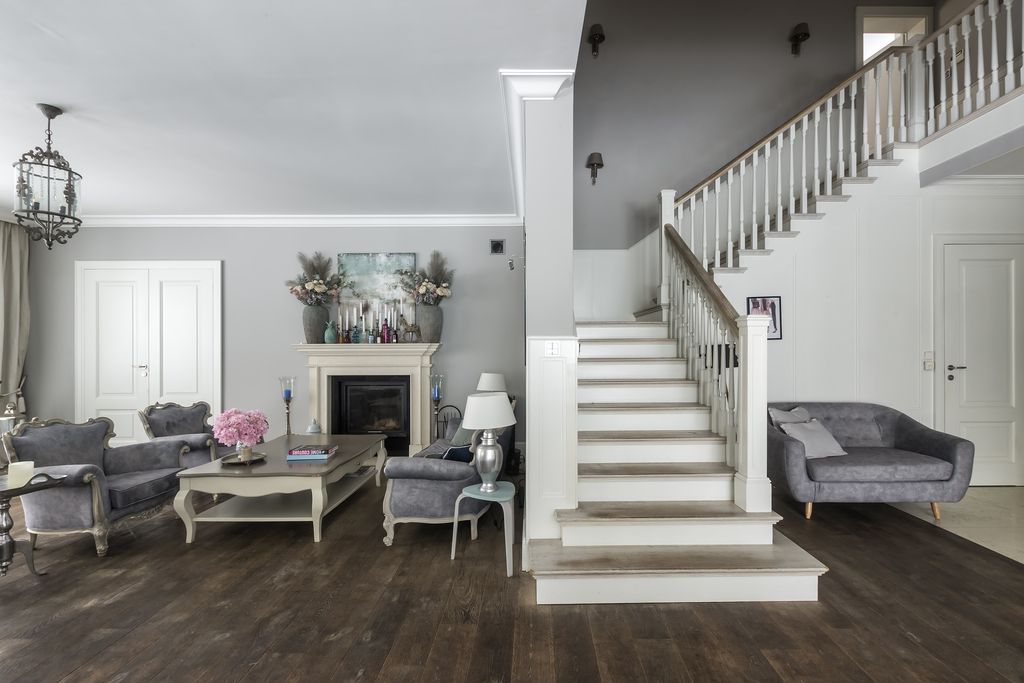 Parter połączony z piętrem reprezentacyjnymi schodami w przestronnym hallu z antresolą.
