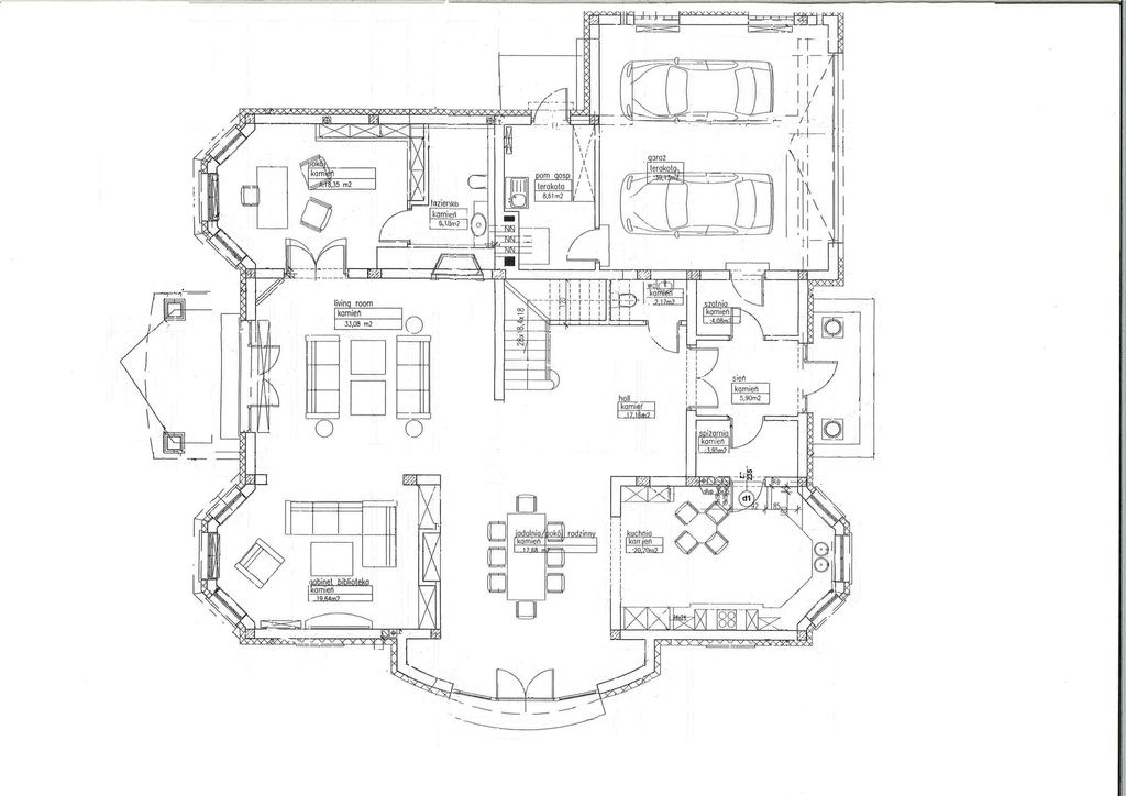 - Kuchnia z aneksem śniadaniowym: 20 m², spiżarnia: 3,95 m²