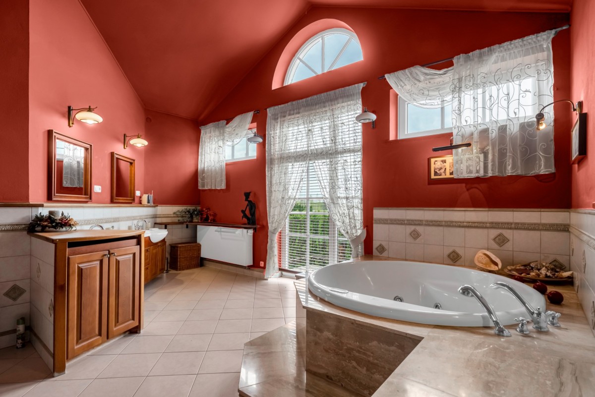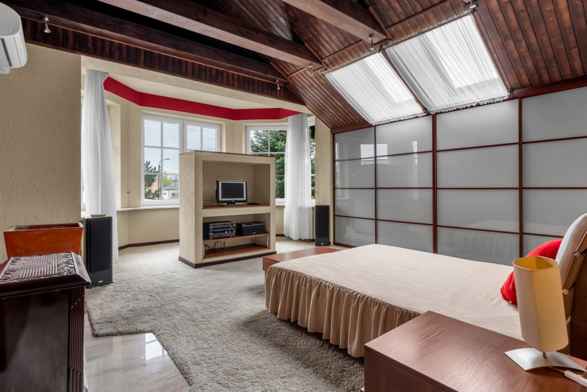 Na pierwszym poziomie łazienki znajdują się dwie oddzielne umywalki z szafkami, ubikacja, bidet, prysznic z biczami wodnymi i okrągła duża wanna z jacuzzi . Na drugim poziomie pokoju kąpielowego znajduje się w pełni wyposażona drewniana sauna na 6 osób, kącik wypoczynkowy i bezpośrednie wyjście na górny taras. Główna sypialnia o powierzchni 35 m2 posiada dwie garderoby, toaletkę i ceramiczny, wolnostojący kominek oraz klimatyzację.