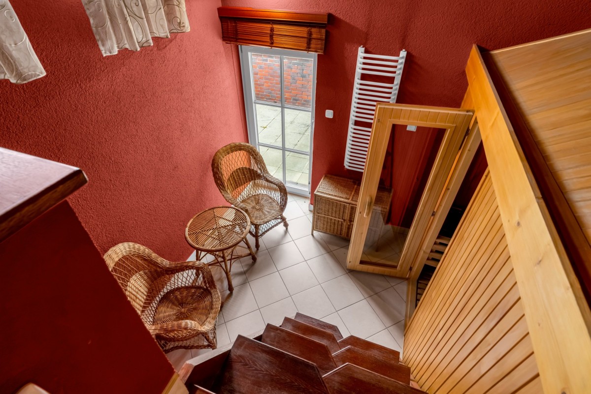 - dwa odrębne pomieszczenia, tworzą dodatkową przestrzeń o powierzchni około 40m2, którą można dowolnie zaadaptować. Znajdują się tu pojemne szafy z półkami, regałami i wieszakami jak również automatyczna bieżnia, urządzenie do wiosłowania i rowerek stacjonarny.