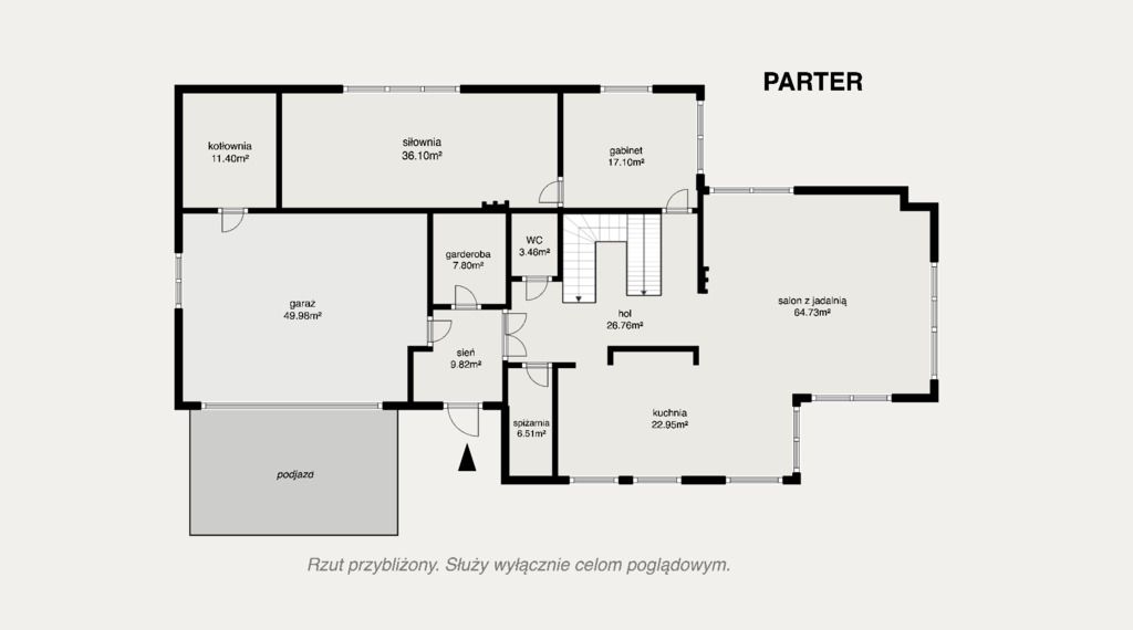 Parter uzupełnia gabinet oraz siłownia, a część techniczna obejmuje kotłownię, pomieszczenie gospodarcze oraz spiżarnię.