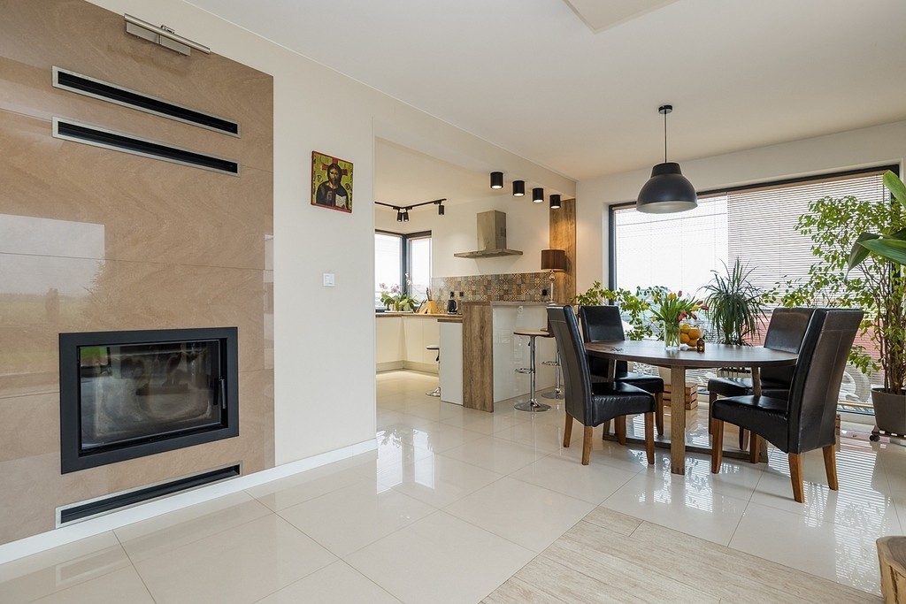 - Salon – przestronny, z kominkiem, który nadaje wnętrzu wyjątkowego klimatu i przytulności. Designerskie oświetlenie, duże przeszklenia z zachodnią ekspozycją, podwieszane sufity, wyjście na taras i zadbany ogród. Ogrzewanie podłogowe w całej strefie dziennej.