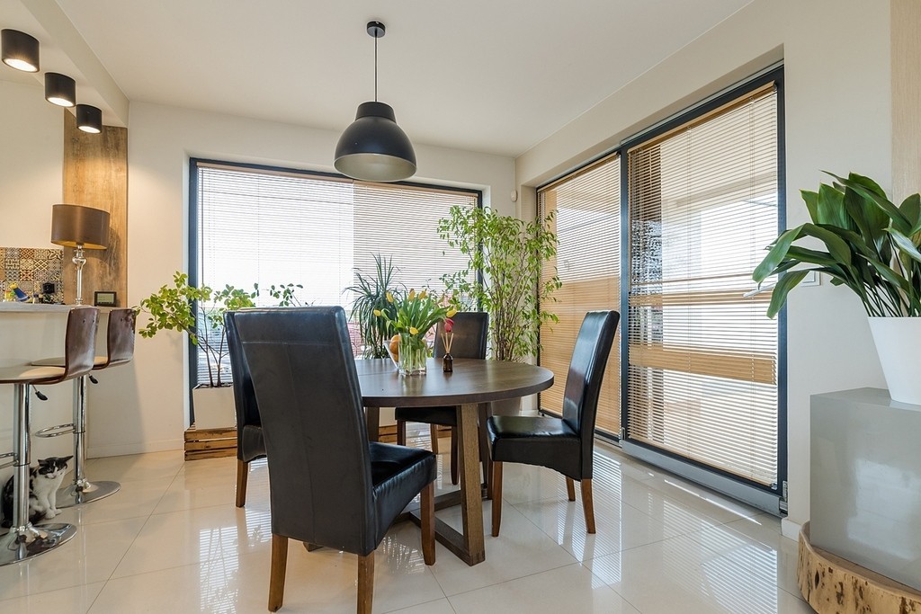 - Jadalnia – klimatyczna, z południową ekspozycją, dużymi oknami i stylowymi żaluzjami drewnianymi.