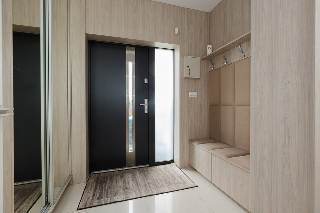 - Przedsionek – z zabudowaną szafą, siedziskiem, system alarmowy.