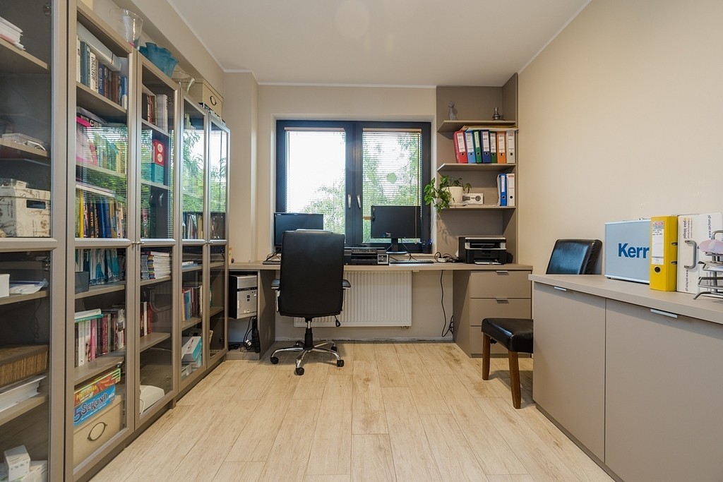 - Gabinet / pokój do pracy – z dużym praktycznym biurkiem i meblami na zamówienie. Idealne miejsce do pracy zdalnej.