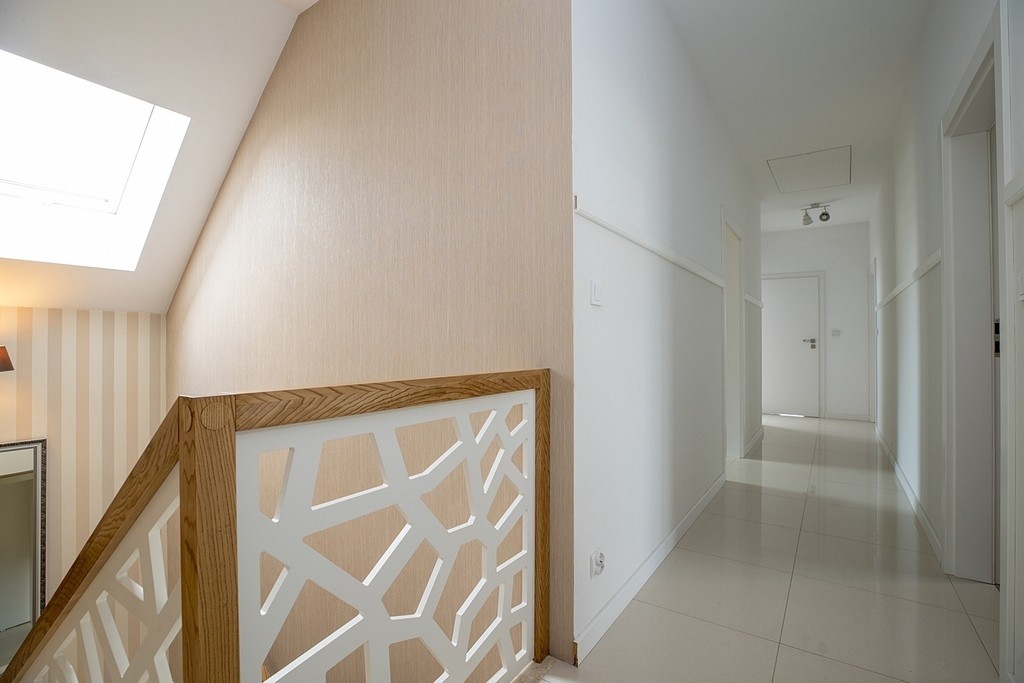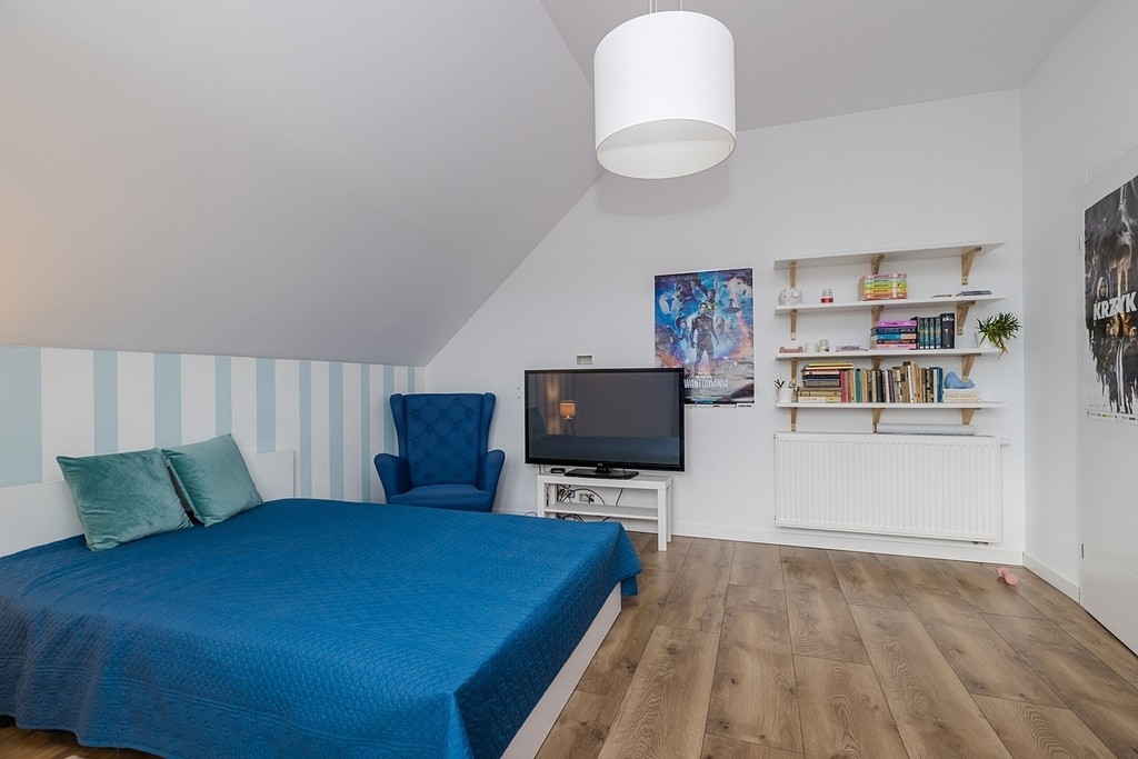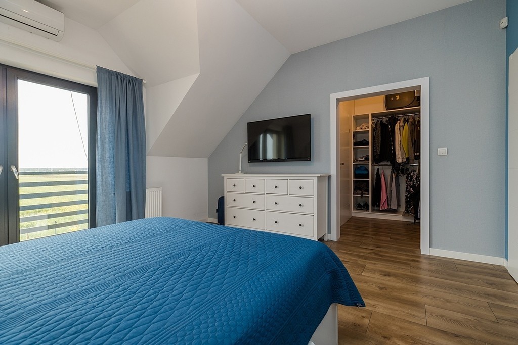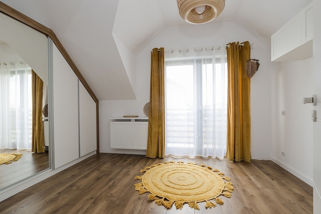 Piętro:- Sypialnia główna (master) – doskonale doświetlone pomieszczenie z zachodnią ekspozycją, wyposażone w duże balkonowe okno z francuskim balkonem, z którego rozpościera się malowniczy widok na otaczającą zieleń i panoramę miasta w oddali. Sypialnia połączona jest z przestronną garderobą oraz prywatną łazienką z prysznicem i oknem dachowym typu Velux.