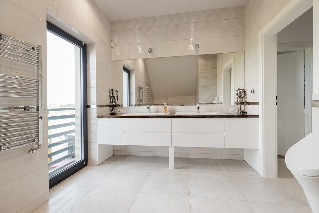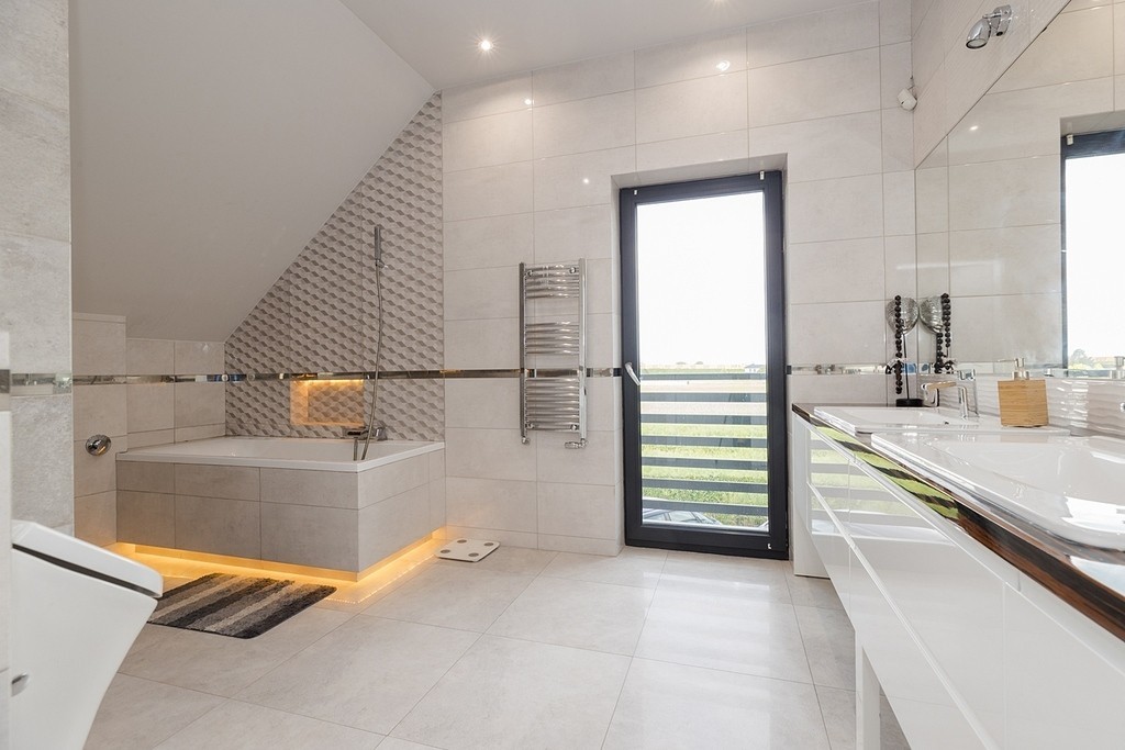 - Łazienka główna – przestronna i jasna, z dużym oknem od strony południowej, wyposażona w wannę, pisuar oraz WC. Znajdują się w niej również funkcjonalne dwie umywalki z zabudowanym blatem oraz pojemne meble do przechowywania. Elegancki charakter wnętrza podkreśla duże lustro na całą szerokość ściany, które optycznie powiększa przestrzeń. Komfort użytkowania zwiększa ogrzewanie podłogowe.