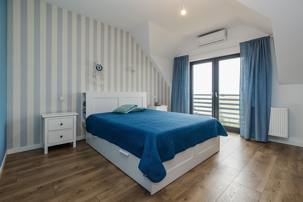 - Druga sypialnia – z dużym balkonowym oknem i ekspozycją południową.