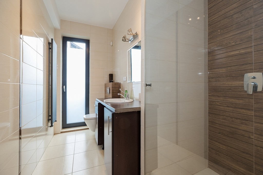 - Łazienka – z dużym oknem, prysznicem, w stonowanej kolorystyce, z ogrzewaniem podłogowym.