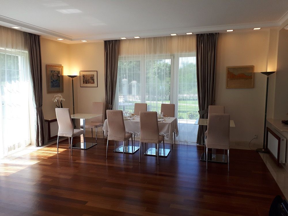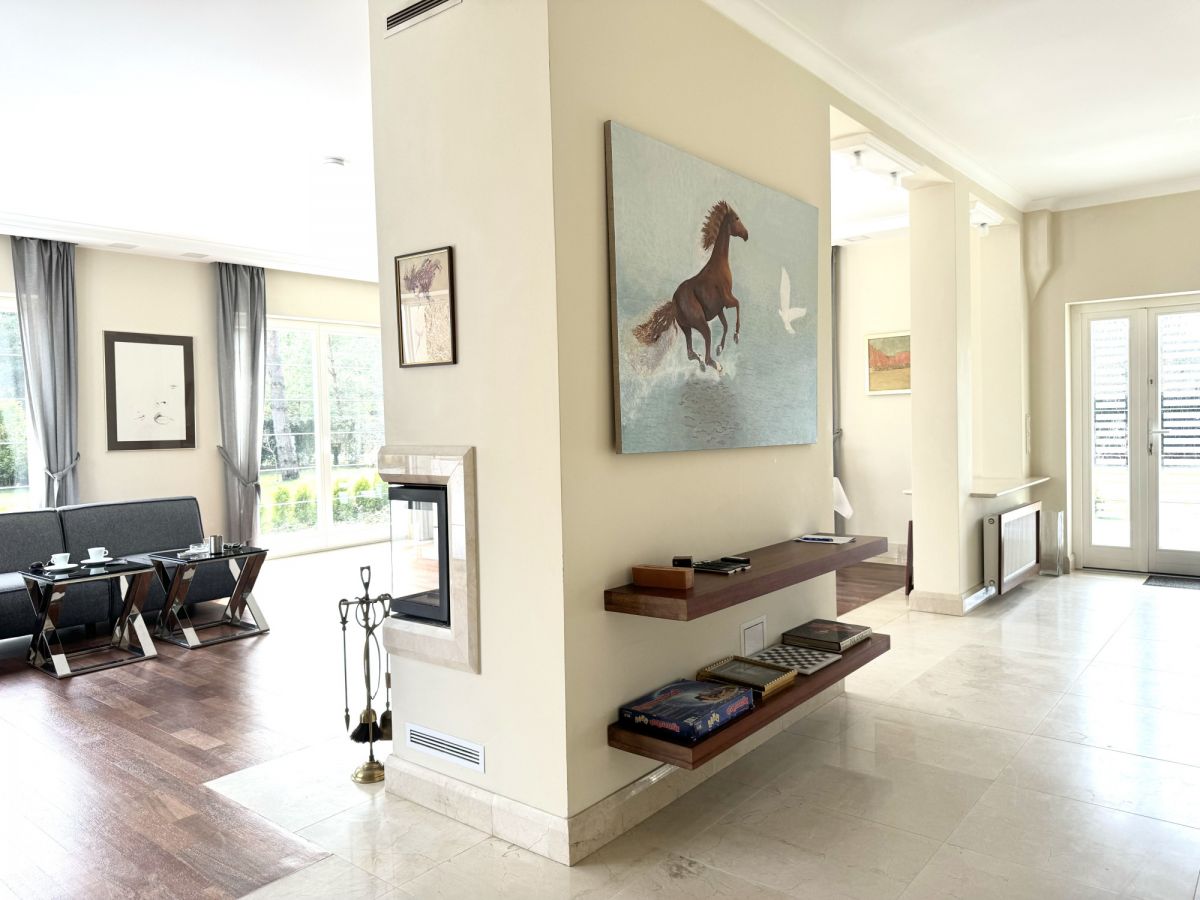 Atutem jest doskonale zaprojektowane wnętrze oraz wygodny układ pomieszczeń. Wszystko tworzy spójną całość. Na parterze znajduje się przestronny salon z kominkiem oraz przytulną jadalnią, wyjście na taras z jacuzzi dla sześciu osób oraz meblami wypoczynkowymi i widokiem na rzekę Narew. Na tym poziomie znajduje się oddzielna kuchnia z profesjonalnym sprzętem przystosowana do przyrządzania posiłków dla większej grupy osób.