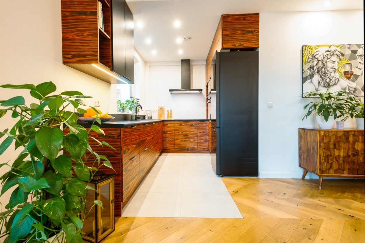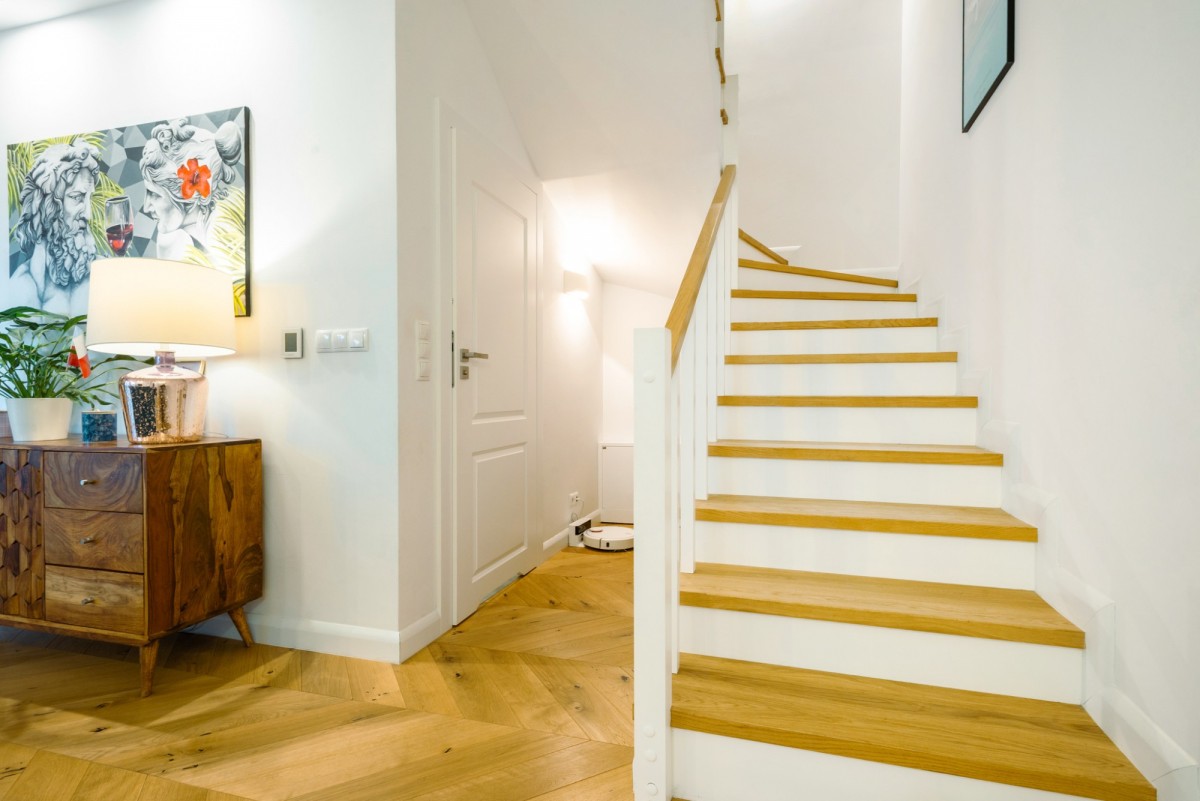 Parter zachwyca przestronnością, światłem i eleganckim wykończeniem. Centralnym punktem domu jest salon z półotwartą kuchnią o powierzchni ponad 41 m², w którym duże przesuwne okna prowadzą bezpośrednio na drewniany taras i ogród. Dzięki temu wnętrze naturalnie łączy się z otoczeniem, tworząc idealną przestrzeń do relaksu i spotkań z bliskimi. Na tym poziomie znajduje się również elegancka łazienka, a funkcjonalny wiatrołap z zabudową stolarską wprowadza ład i porządek.