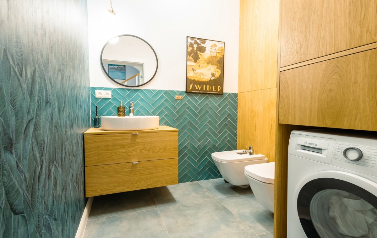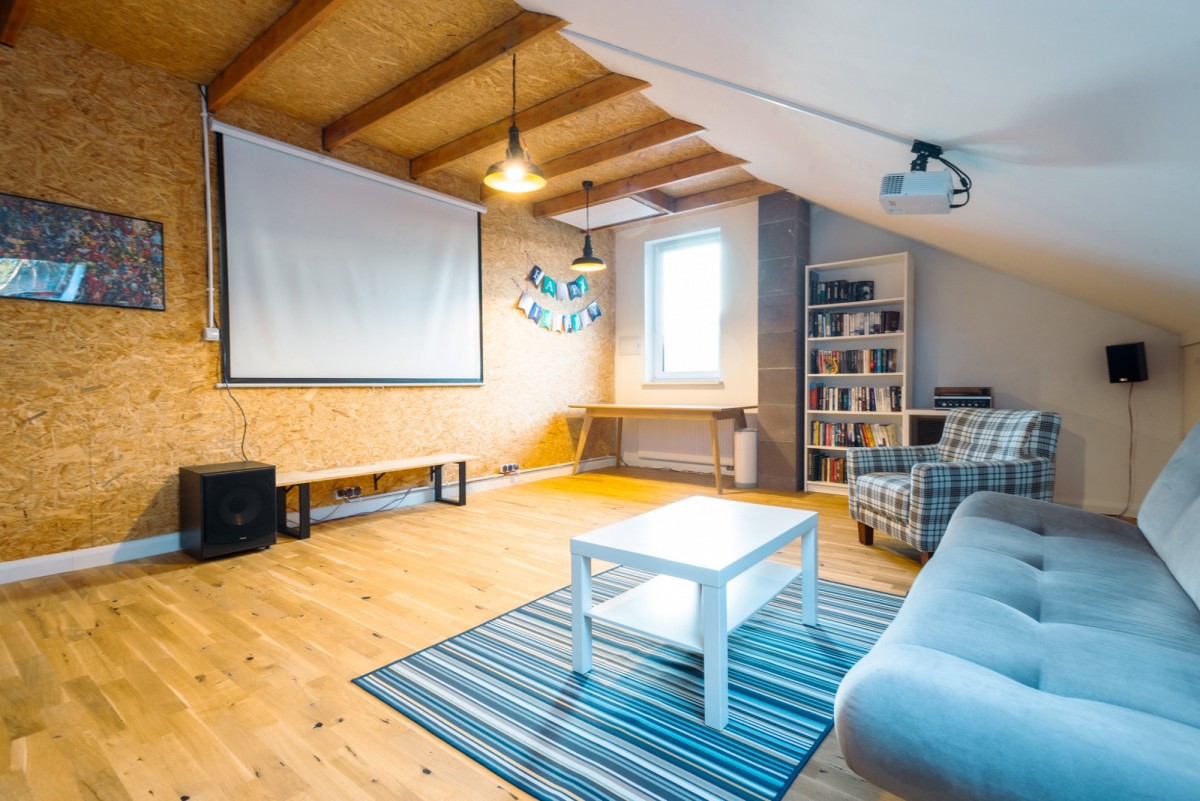 Poddasze stanowi dodatkową, wyjątkowo atrakcyjną przestrzeń o powierzchni około 30 m². Obecnie pełni funkcję klimatycznej sali kinowej, idealnej do relaksu i spotkań z rodziną. Dzięki doprowadzonej instalacji wodnej można tu z łatwością stworzyć dodatkową łazienkę lub niezależną strefę prywatną. Liczne zabudowy w skosach zapewniają dużą powierzchnię do przechowywania, utrzymując porządek na pozostałych kondygnacjach.