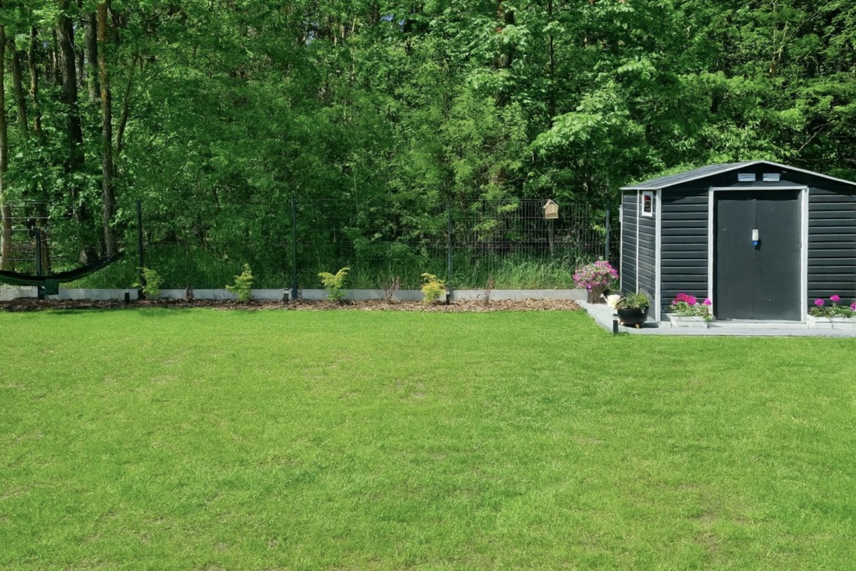 Do domu przynależy ogród o powierzchni 176 m², który w harmonijny sposób łączy się z otaczającym lasem. Drewniany taras pozwala cieszyć się przyrodą bezpośrednio z salonu, a solidny domek narzędziowy i dwa miejsca postojowe przy domu zwiększają wygodę codziennego życia. Całość tworzy kameralną, spokojną inwestycję, w której natura i komfort współistnieją w idealnej równowadze.