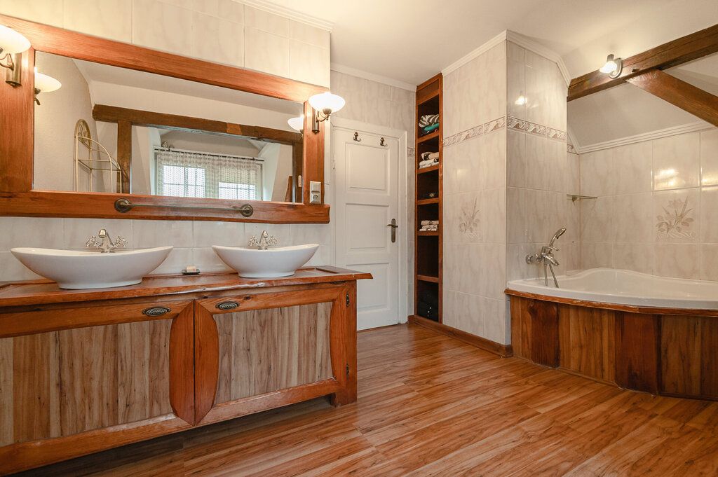 Dom główny Sześć dobrze doświetlonych pokoi, dwie łazienki, strych, piwnica, ogrzewanie gazowe i kominek. Wnętrza są w pełni gotowe do zamieszkania – bez remontu, bez adaptacji. Pierwszego dnia rozpakowujesz walizki.