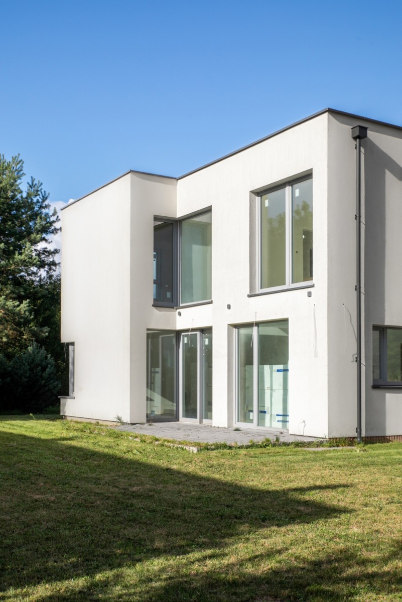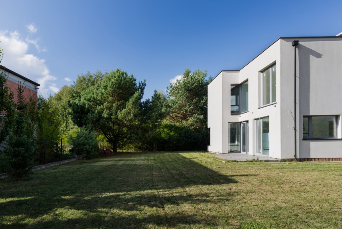 Dom wyróżnia się nowoczesną, przemyślaną bryłą i dużą ilością przeszkleń, które zapewniają doskonałe doświetlenie wnętrz przez cały dzień. Duże okna nie tylko wprowadzają do środka naturalne światło, ale również otwierają przestrzeń na otoczenie i ogród. Z przestronny taras na piętrze zaprasza do pracy zdalnej, delektując się widokiem na las i otwartą przestrzeń łąk, na których znajdują się siedliska lęgowe ptaków.