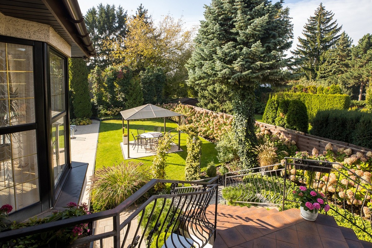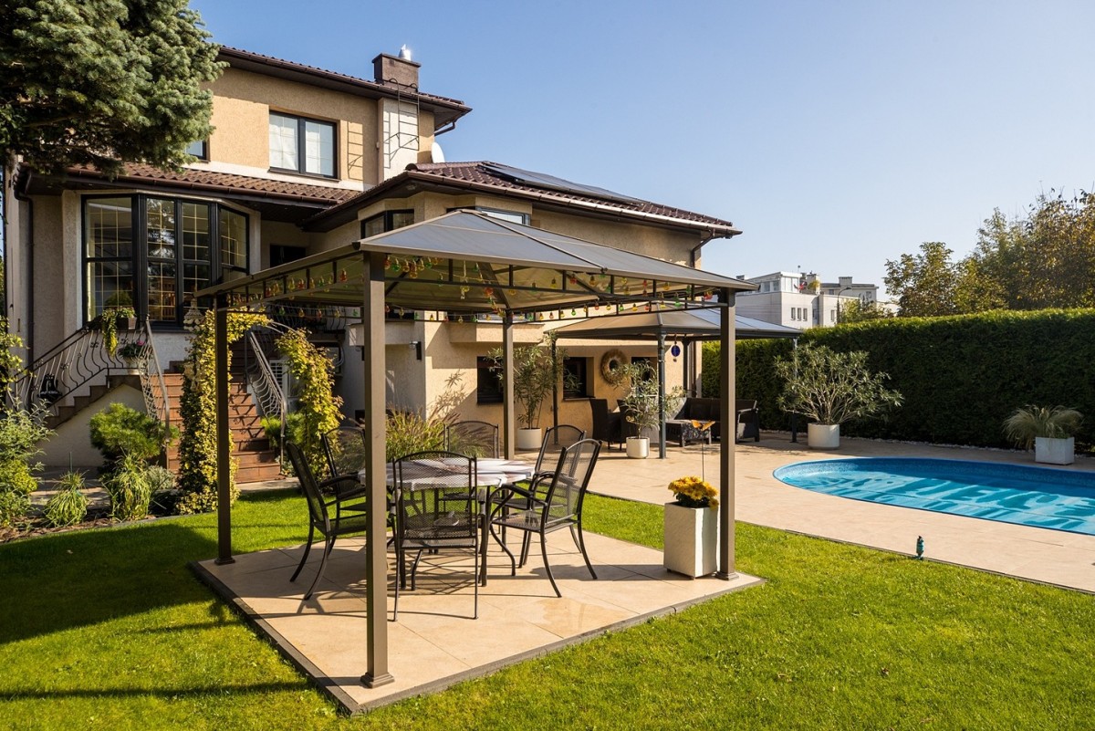 Zewnętrzna część domu to prawdziwa oaza spokoju - przepięknie zagospodarowany ogród z basenem, idealne miejsce na relaks. Zielona przestrzeń z miejscami do wypoczynku, prywatność, której nie znajdziesz w żadnej innej lokalizacji, oferują wyjątkowe warunki do codziennego życia.