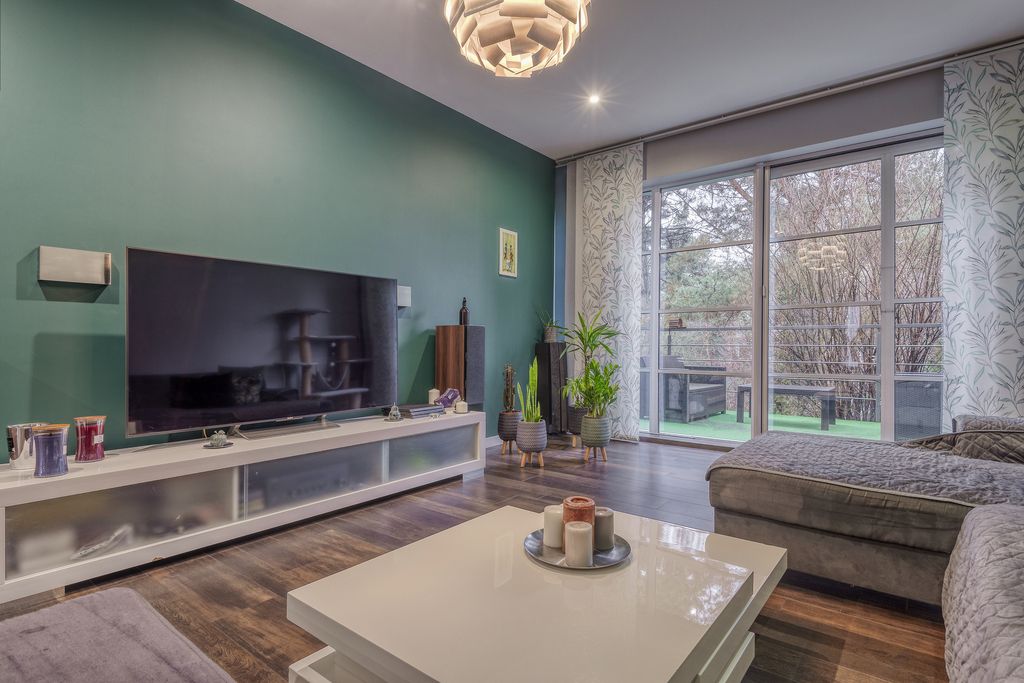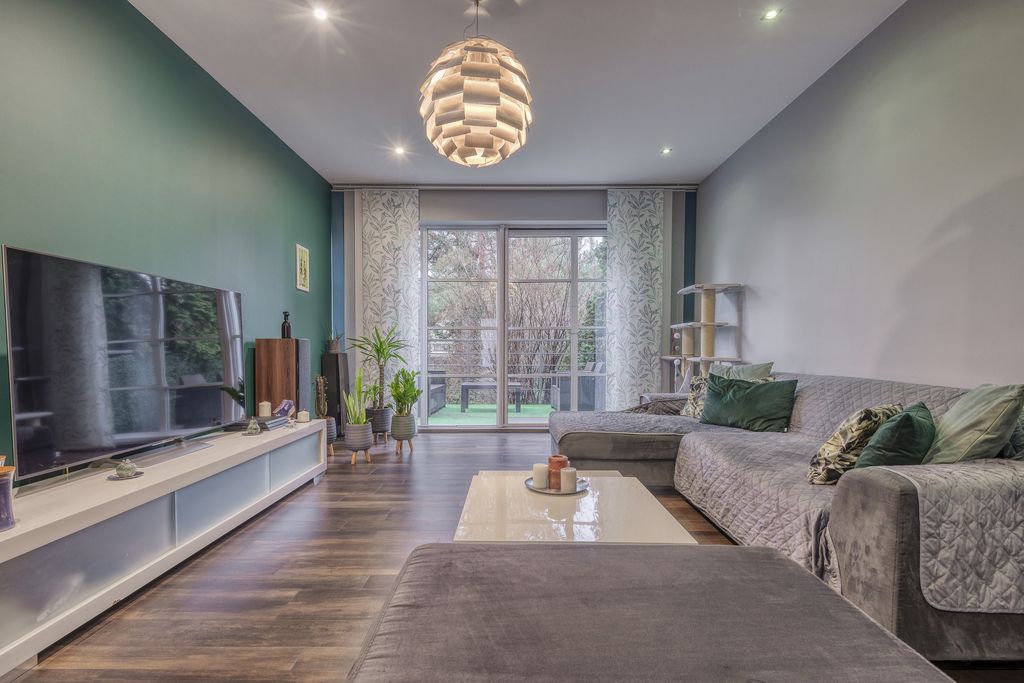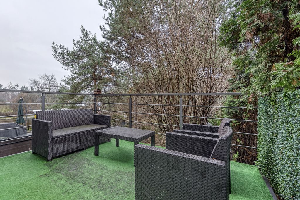 - Przestronny i elegancki salon z wyjściem na duży taras o powierzchni ok. 12 m² z meblami ogrodowymi