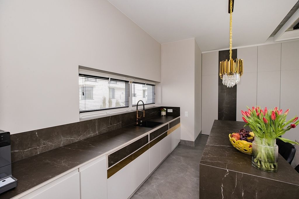 Wysokie sufity w połączeniu z panoramicznymi przeszkleniami sprawiają, że wnętrza są skąpane w naturalnym świetle, co potęguje poczucie przestronności. Unikatowym elementem domu jest szklany, słoneczny łącznik - prestiżowa strefa idealna na prywatną galerię sztuki lub zimowy ogród. Dopełnieniem całości jest drewniany taras, który pełni rolę stylowego patio.