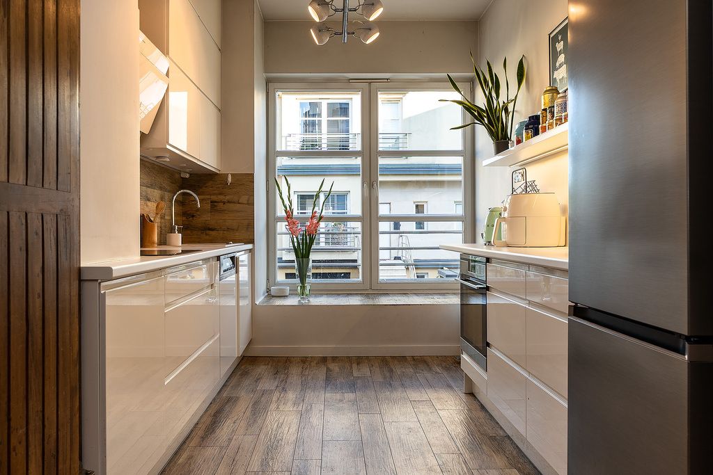 W salonie i kuchni wysokie dwuskrzydłowe okna wprowadzające do wnętrza dużo światła.