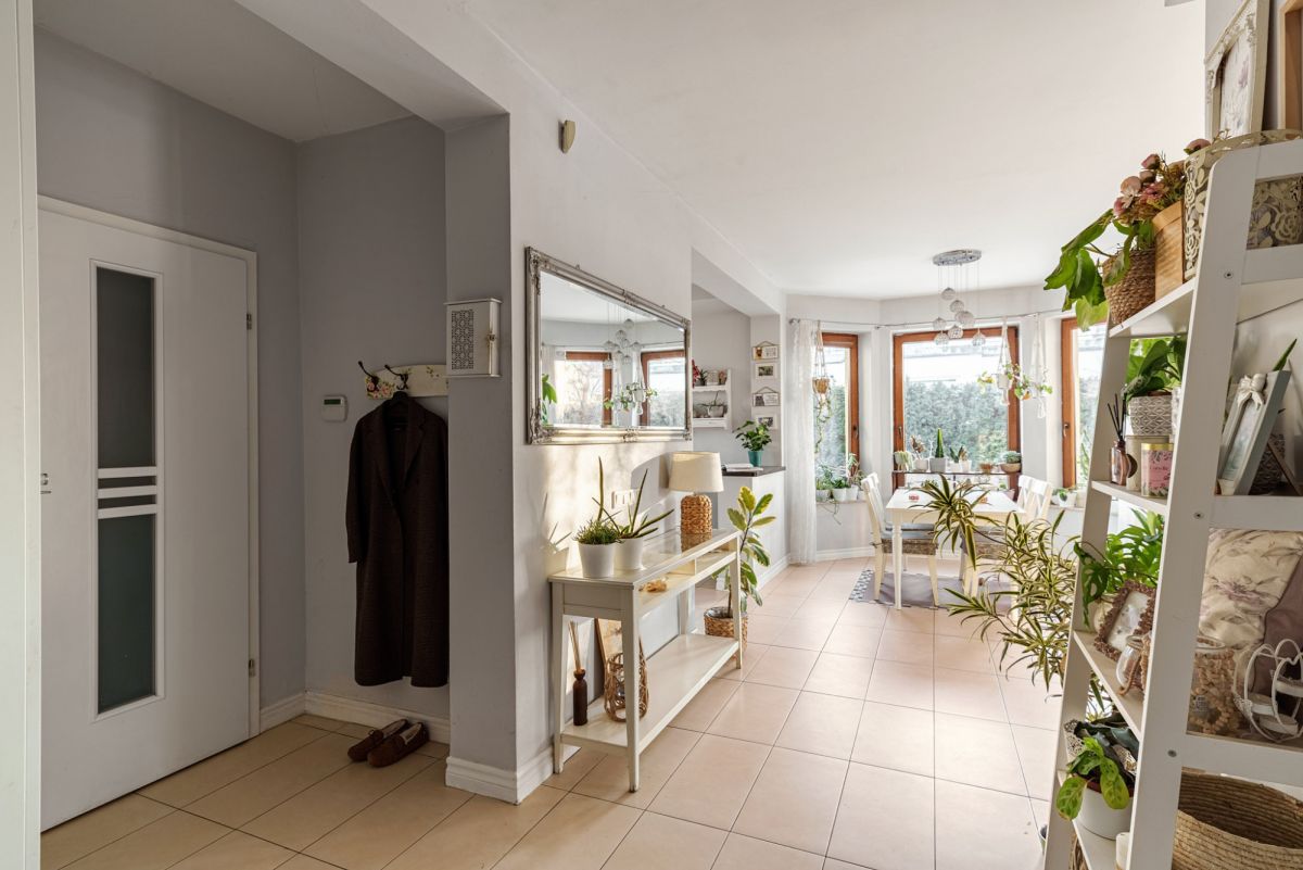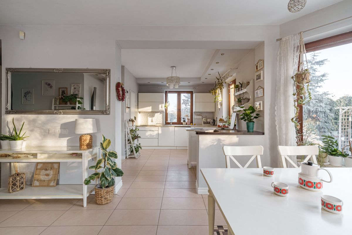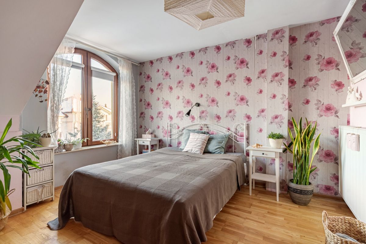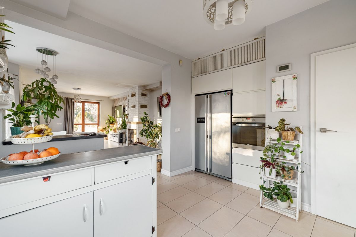 Strefa prywatna obejmuje cztery ustawne pokoje, każdy z miejscem na dużą garderobę, oraz przestronną łazienkę z narożną wanną. Pomieszczenia są doskonale doświetlone dzięki dużym oknom, z których rozciąga się widok na starannie zagospodarowaną zieleń posesji oraz okoliczne tereny otwarte i pola, co dodatkowo potęguje poczucie przestrzeni i spokoju.