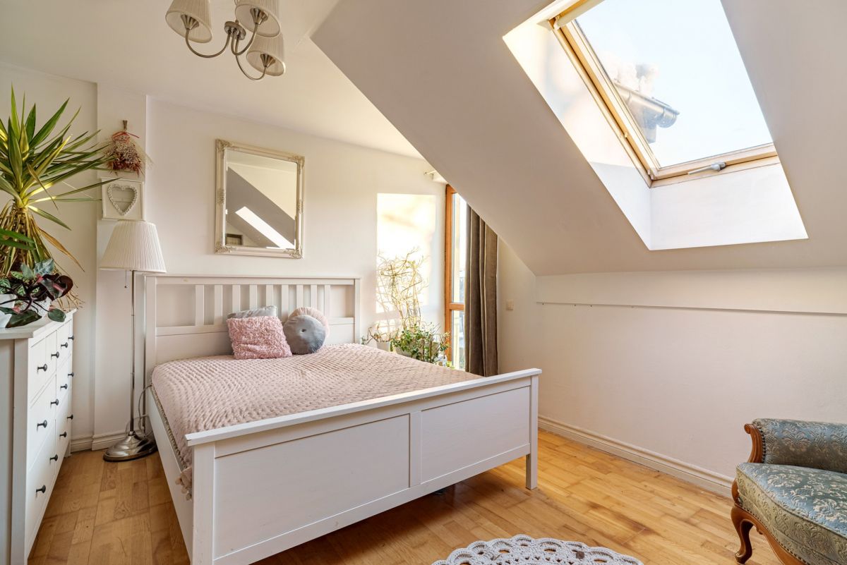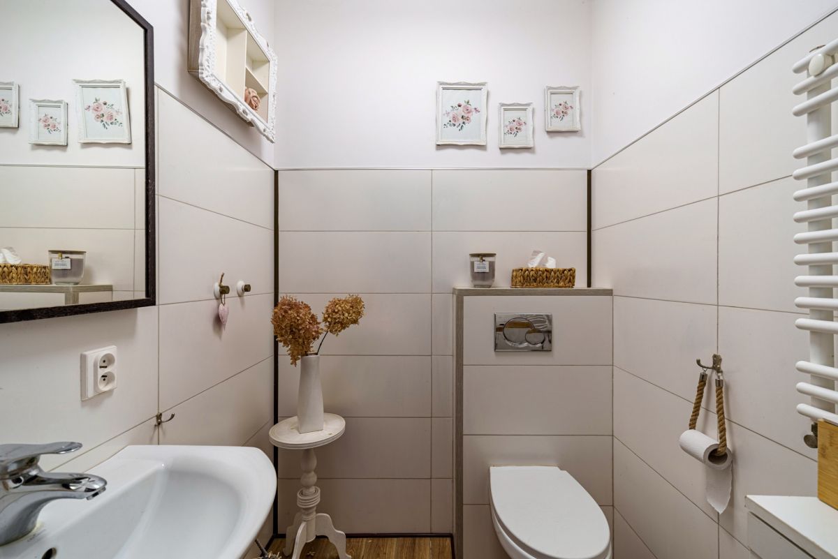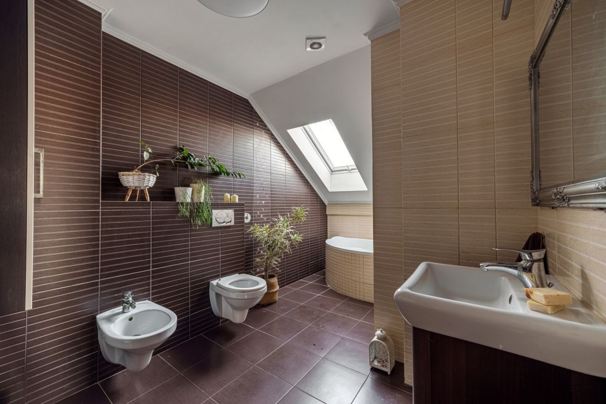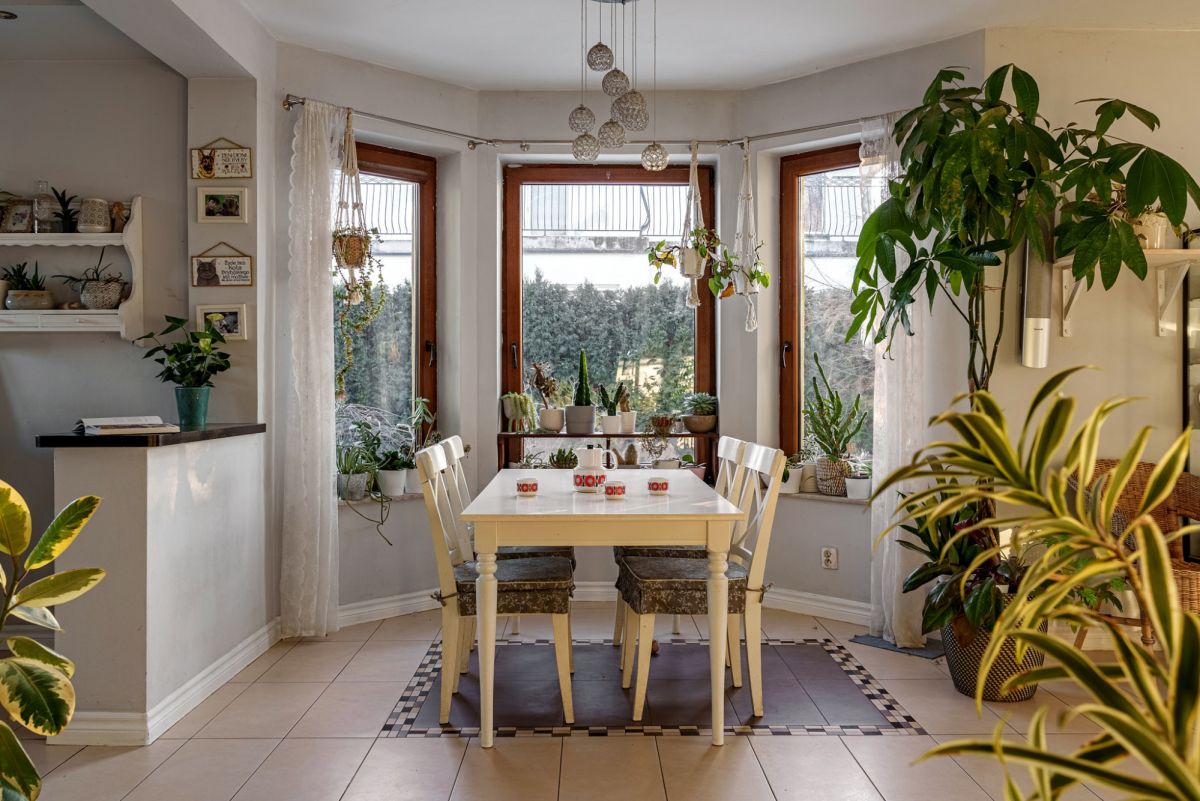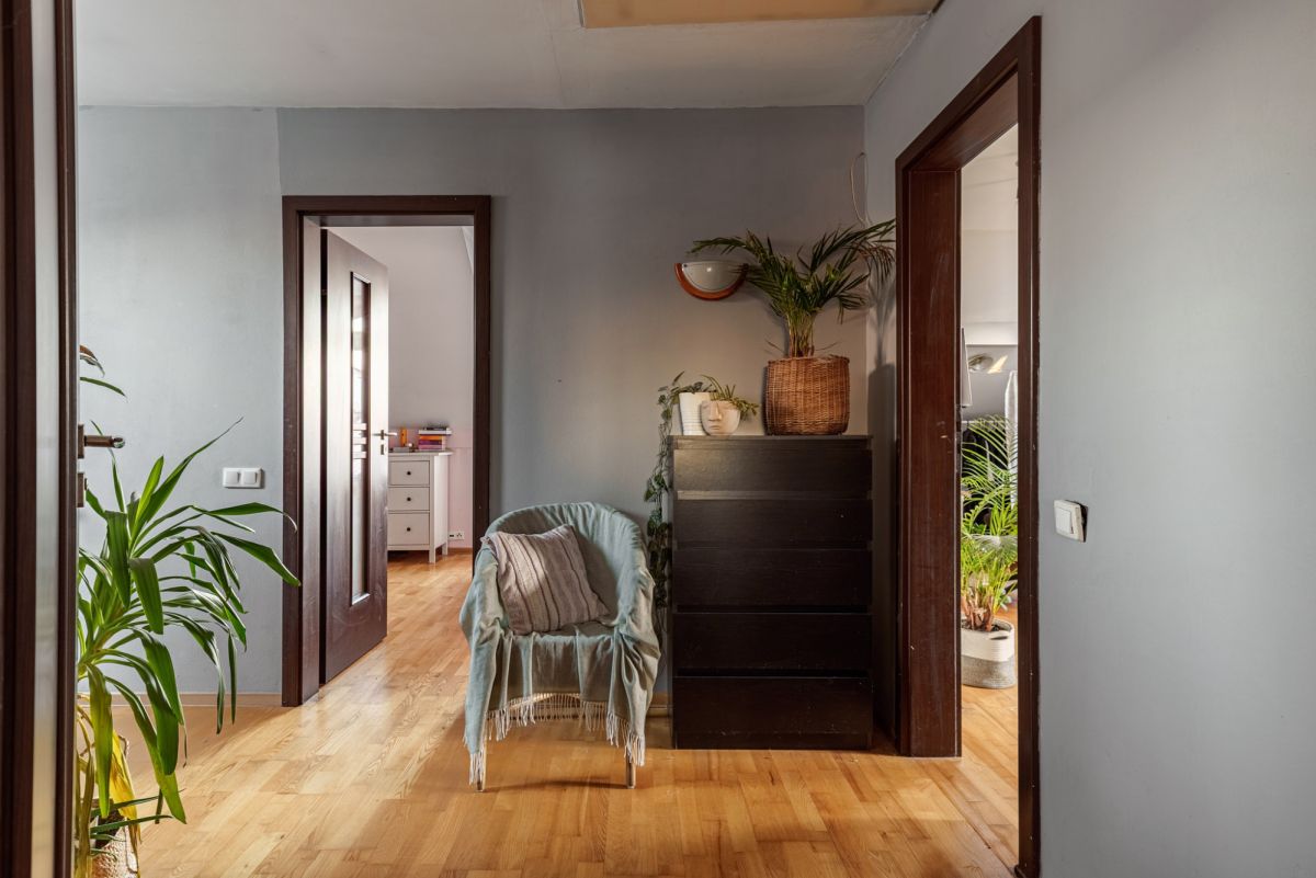 Strefa prywatna obejmuje cztery ustawne pokoje, każdy z miejscem na dużą garderobę, oraz przestronną łazienkę z narożną wanną. Pomieszczenia są doskonale doświetlone dzięki dużym oknom, z których rozciąga się widok na starannie zagospodarowaną zieleń posesji oraz okoliczne tereny otwarte i pola, co dodatkowo potęguje poczucie przestrzeni i spokoju.
