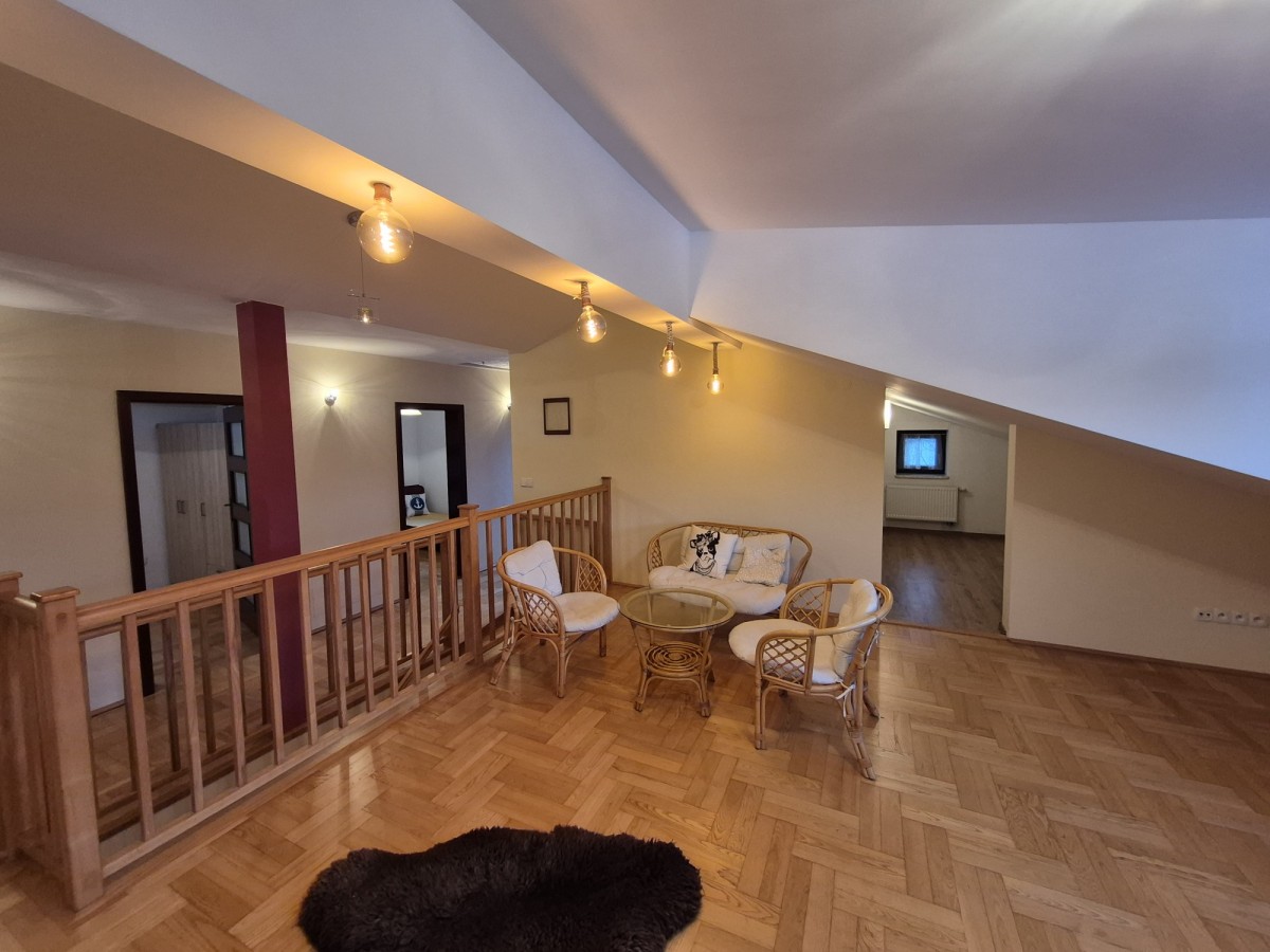 Dom o powierzchni 200 m², usytuowany na zagospodarowanej działce ok. 1000 m², składa się z dwóch kondygnacji: