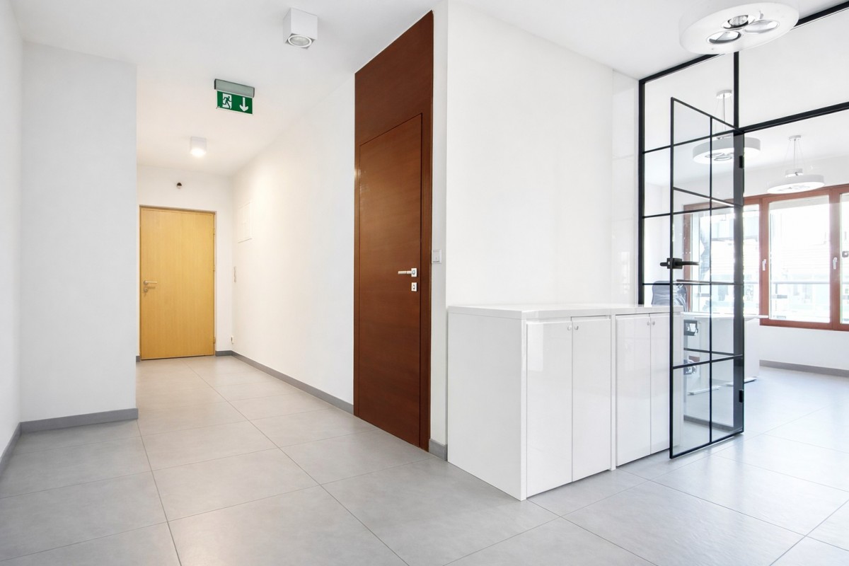 The premises with an area of approx. 96.5 m² are located on the 2nd floor of a modern residential and office building with a reception desk and 24-hour security. The property was originally designed as an apartment but has been adapted into a functional office space.