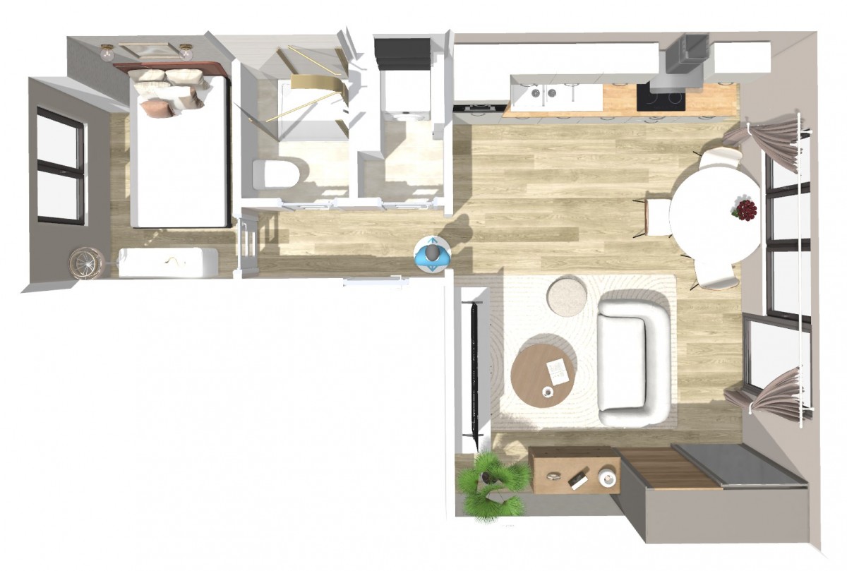 Mieszkanie ma duży potencjał inwestycyjny - można zachować aktualny układ lub przenieść kuchnię do pokoju, tworząc ustawny salon z aneksem kuchennym, dzięki czemu zyskasz mała, acz osobną sypialnię.