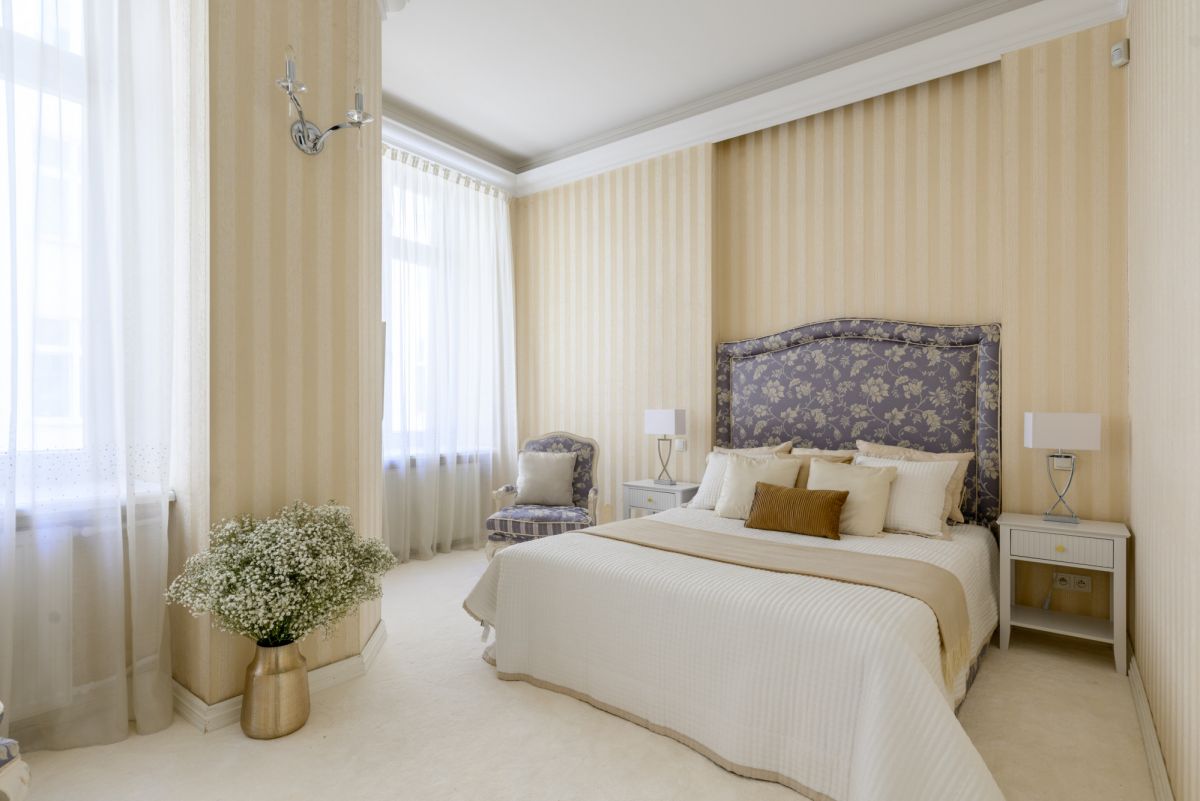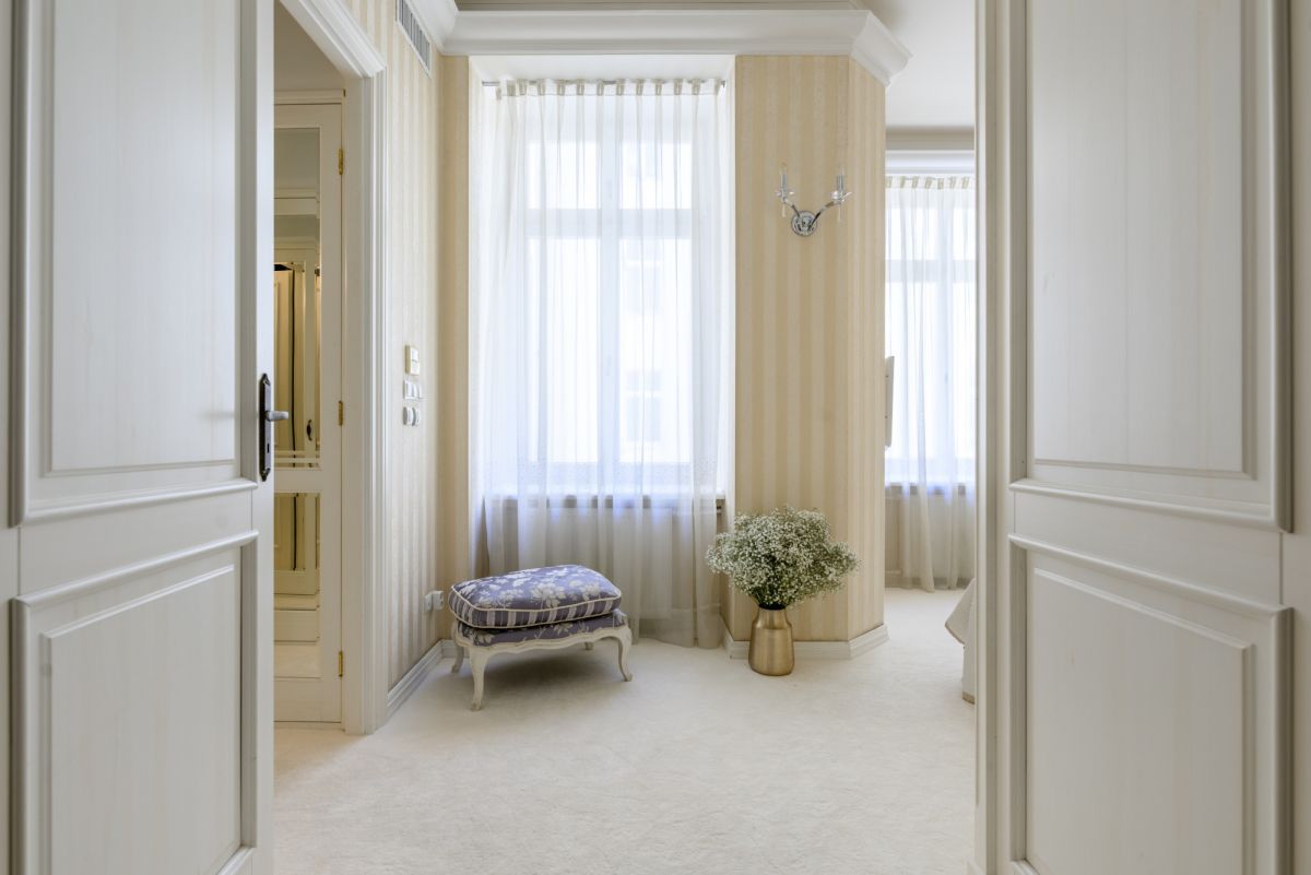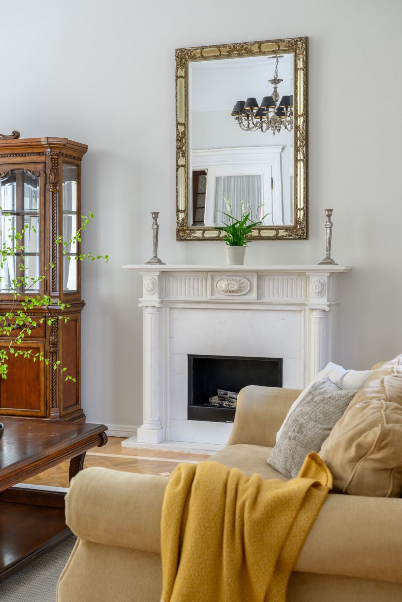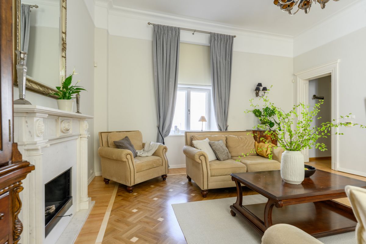 The apartment has undergone a complete renovation, including replacement of all windows and doors with wooden ones, new electrical and plumbing systems, new floors, and plastering. It is air-conditioned and equipped with electric interior blinds. Finished to a high standard in a classic style while preserving the historic character of the building. A marble fireplace with a biofuel insert has been installed in the living room.