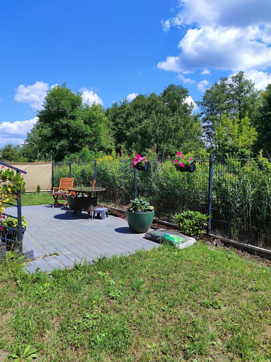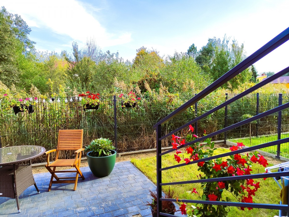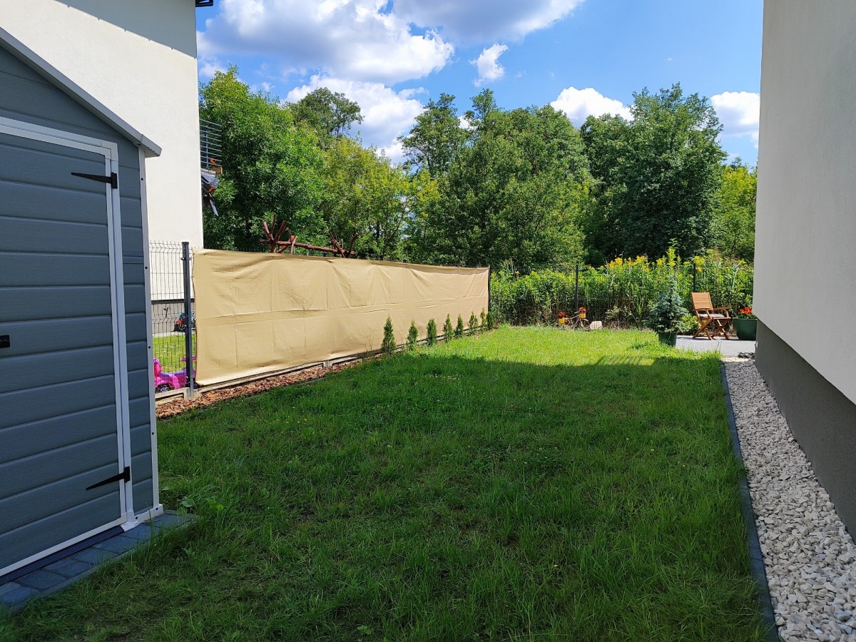 Łącznikiem mieszkania z ogrodem są schodki tarasowe z poręczami. Ogród ma powierzchnię 123m2 i okala mieszkanie z dwóch stron. Na jego terenie znajdują się: domek na akcesoria ogrodowo - działkowe ( np. kosiarka) oraz drewutnia. W tym roku nawieziono ziemię i posiano trawę.