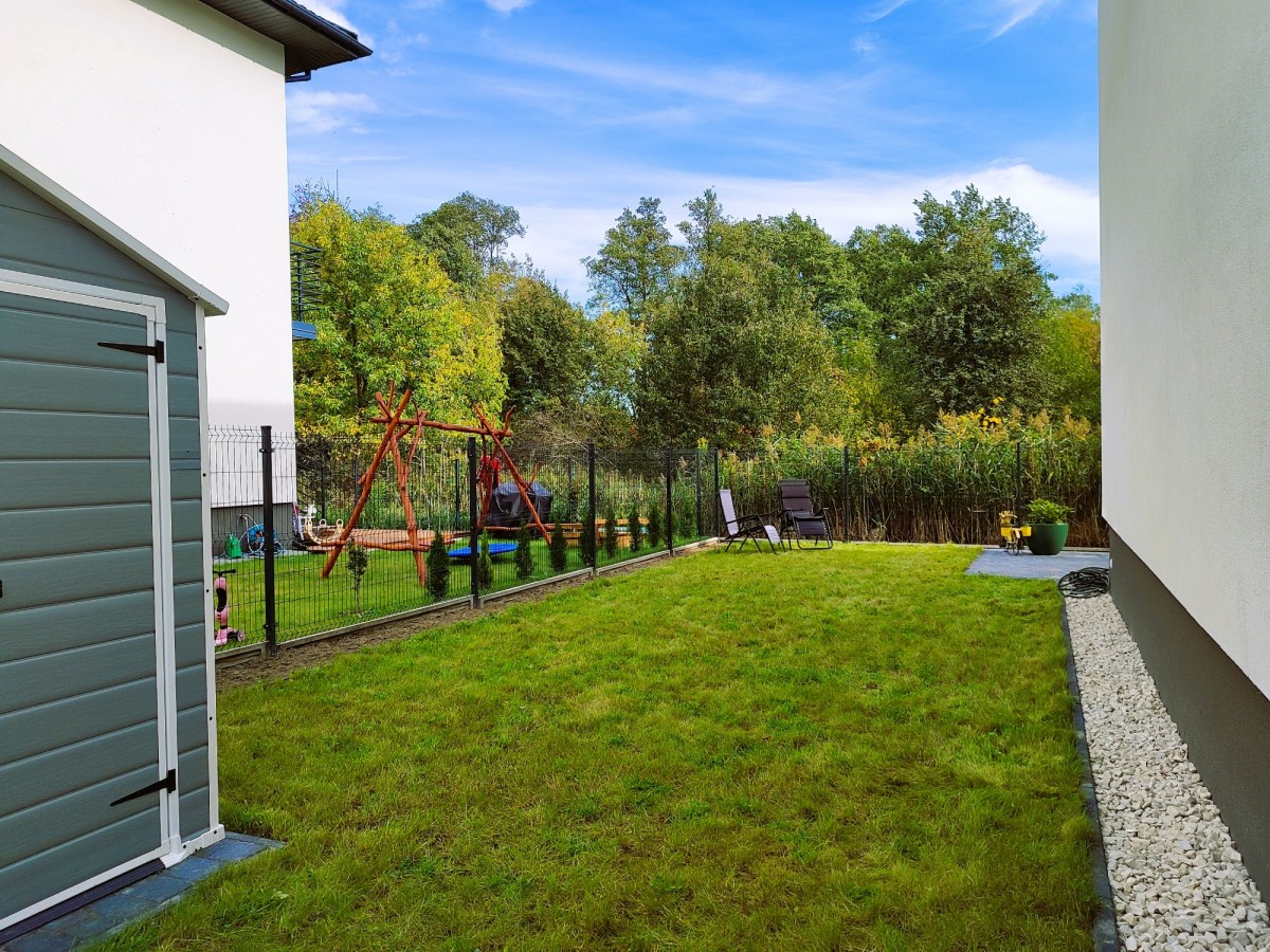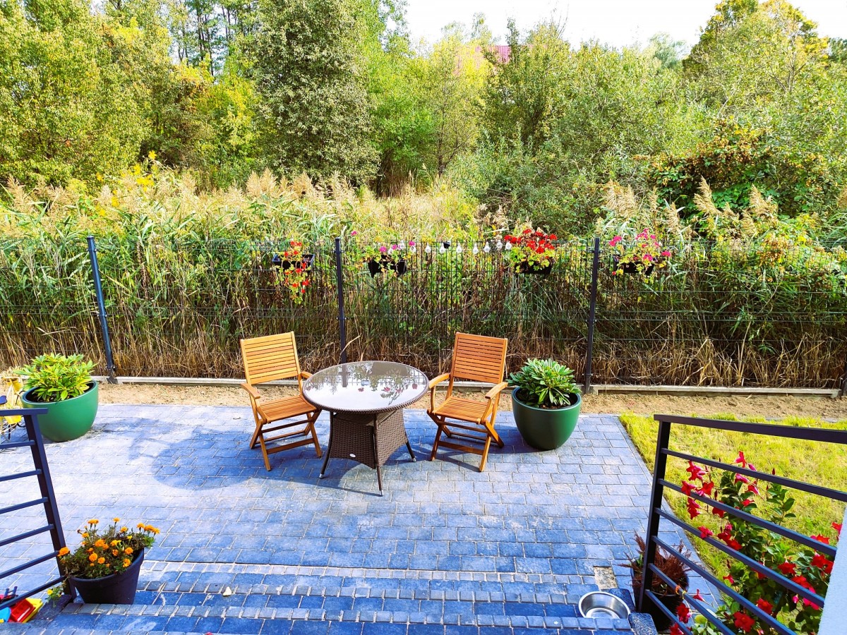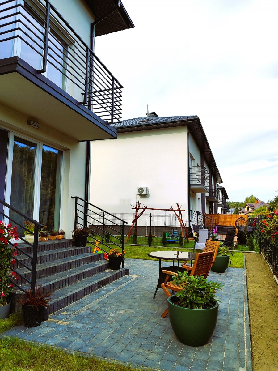 Łącznikiem mieszkania z ogrodem są schodki tarasowe z poręczami. Ogród ma powierzchnię 123m2 i okala mieszkanie z dwóch stron. Na jego terenie znajdują się: domek na akcesoria ogrodowo - działkowe ( np. kosiarka) oraz drewutnia. W tym roku nawieziono ziemię i posiano trawę.