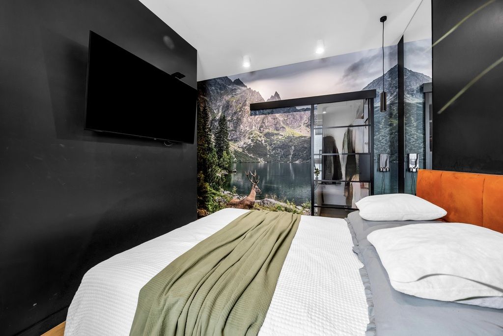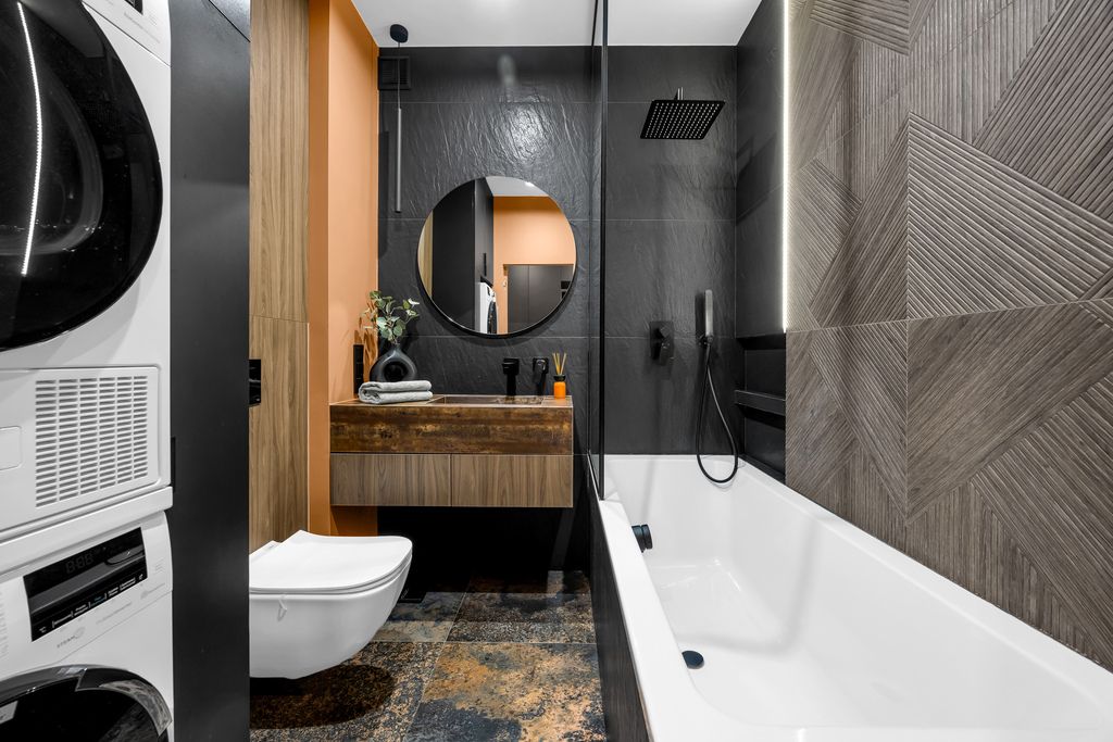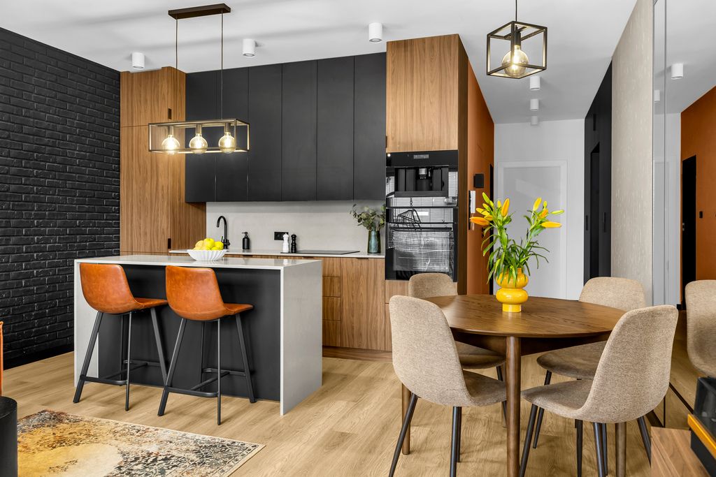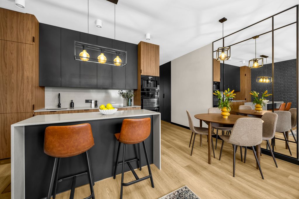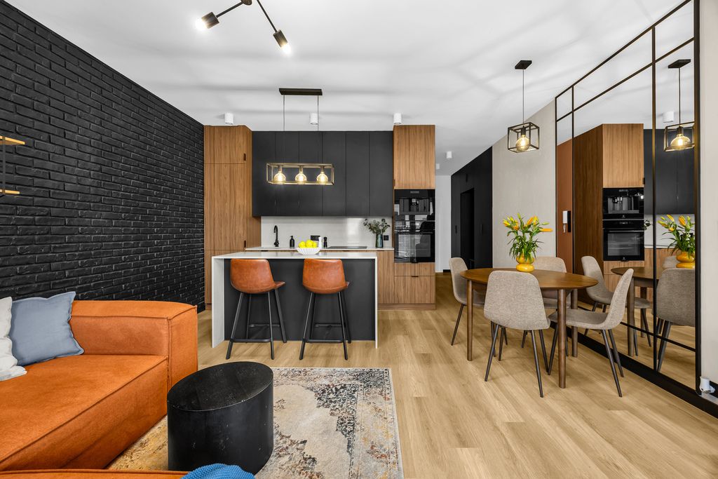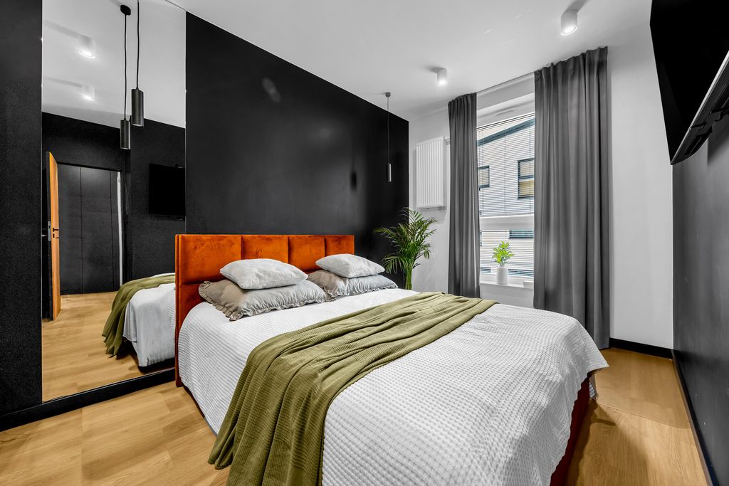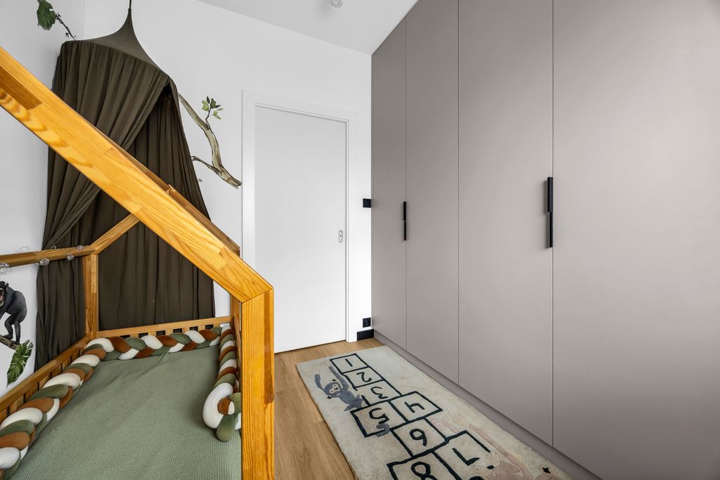 Kuchnia została wykończona z dbałością o detale – kamienny blat to nie tylko estetyka, ale i trwałość na lata. Na podłogach panele winylowe – odporne, praktyczne, a przy tym eleganckie. W sypialni wydzielono dodatkową przestrzeń na garderobę, dzięki czemu poranki przebiegają sprawniej, a szafa w salonie przestaje być koniecznością.