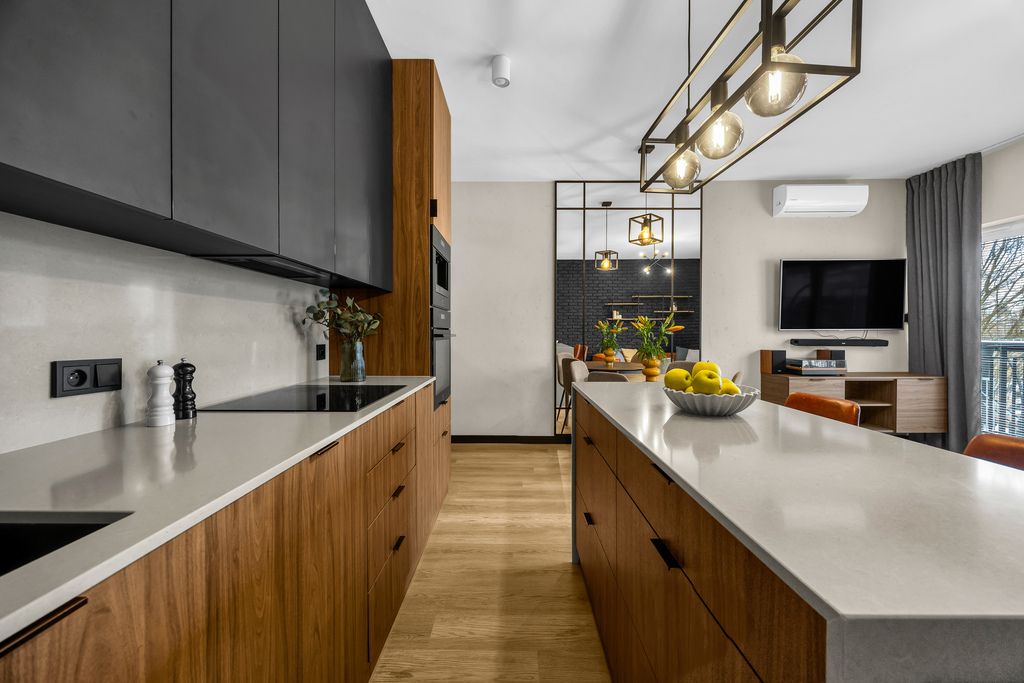 The kitchen has been finished with attention to detail — a stone countertop offers not only elegance but long-term durability. Vinyl flooring throughout the apartment is resistant, practical, and stylish. In the bedroom, a separate wardrobe space has been cleverly designed, making mornings smoother and freeing the living area from unnecessary storage.