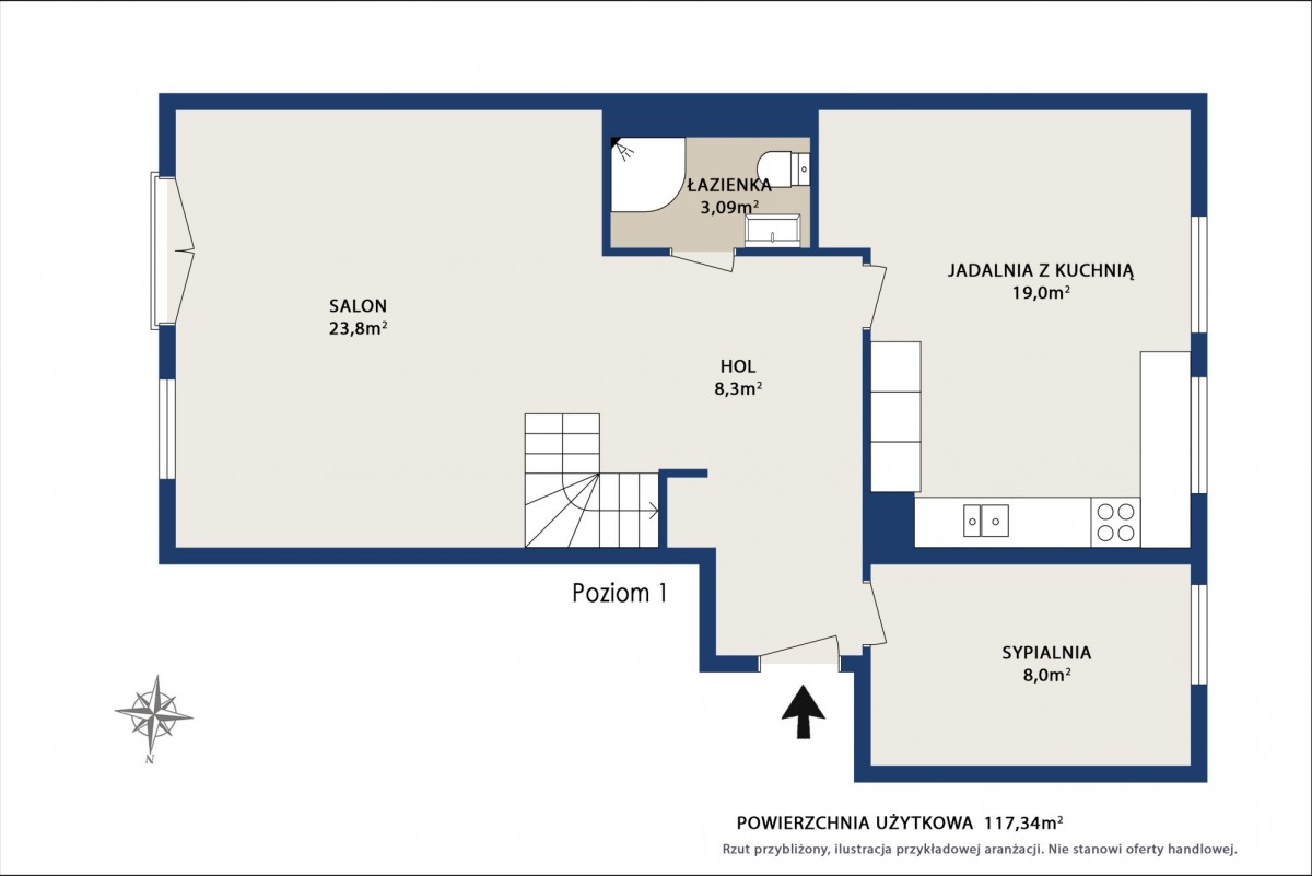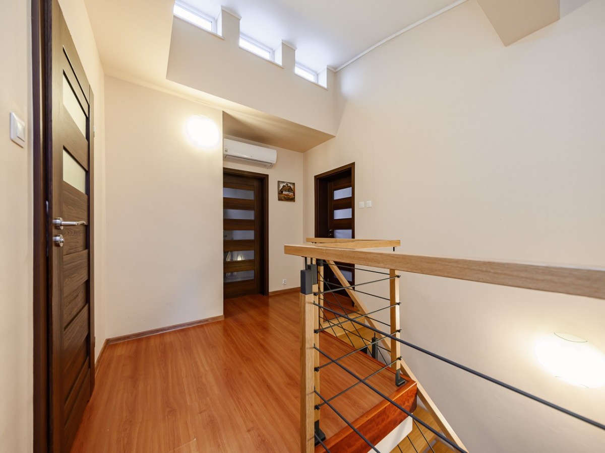Duży, przestronny salon, ustawna kuchnia z jadalnią - dużo blatu, miejsca do przechowywania i przestrzeń na duży stół, pokój pełniący funkcję garderoby (możliwość wykorzystania jako gabinet), hol ze schodami prowadzącymi na drugi poziom.