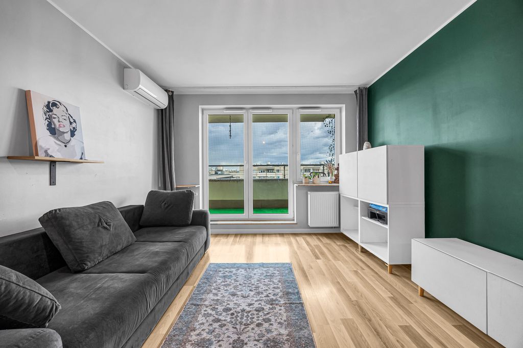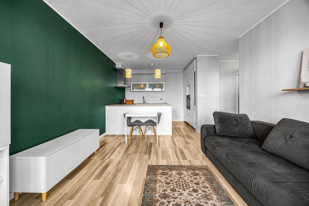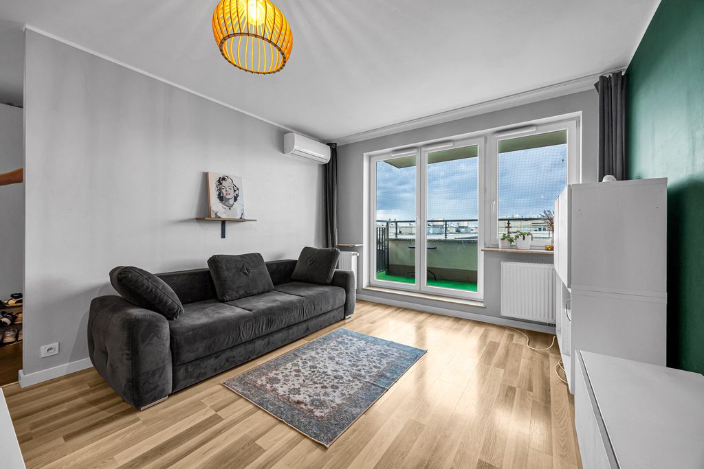 -jasny salon z aneksem kuchennym i wyjściem na duży balkon (ok. 11 m²),