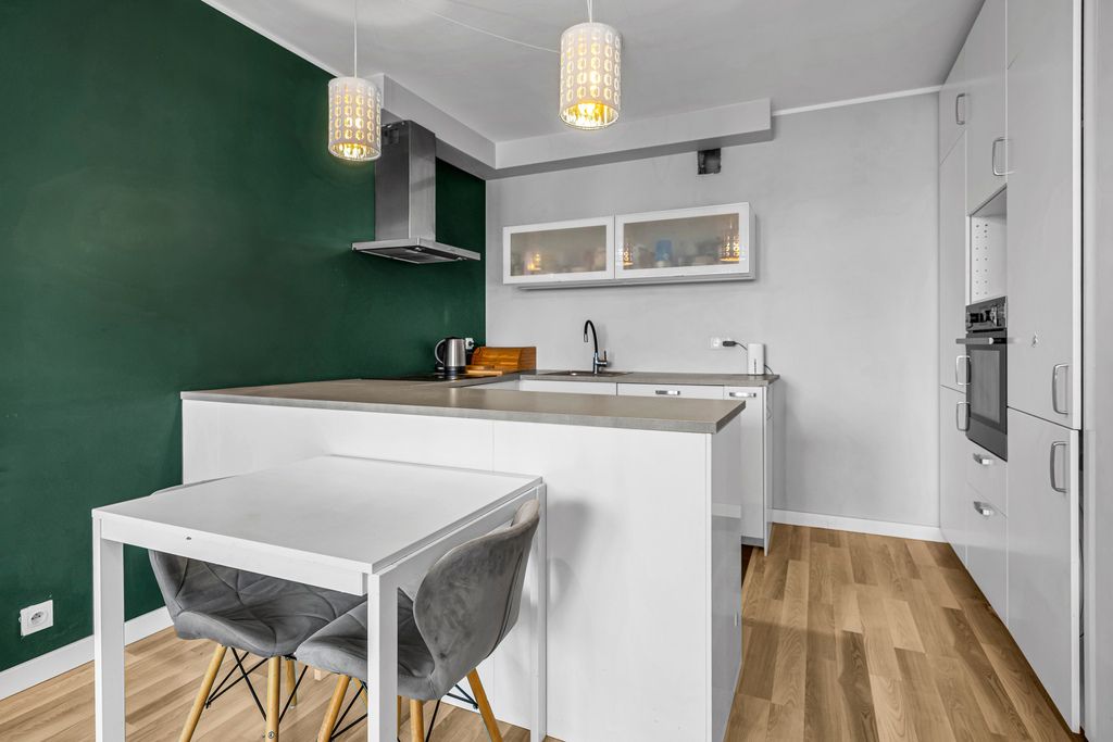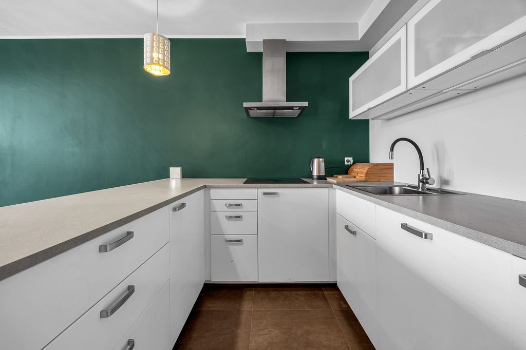 -zabudowa kuchenna z płytą indukcyjną, piekarnikiem, zmywarką, lodówką i pralką,