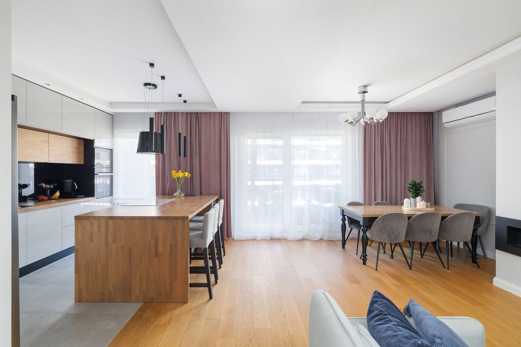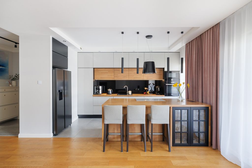 - Zabudowa kuchenna, stół, szafki i blat z litego drewna