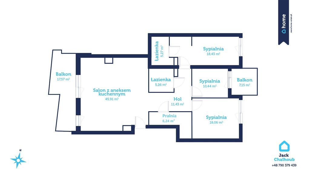 - Sypialnia (18,06 m²) z ekspozycją wschodnią