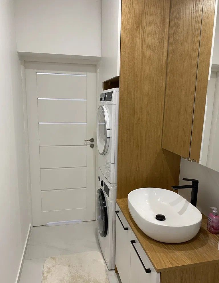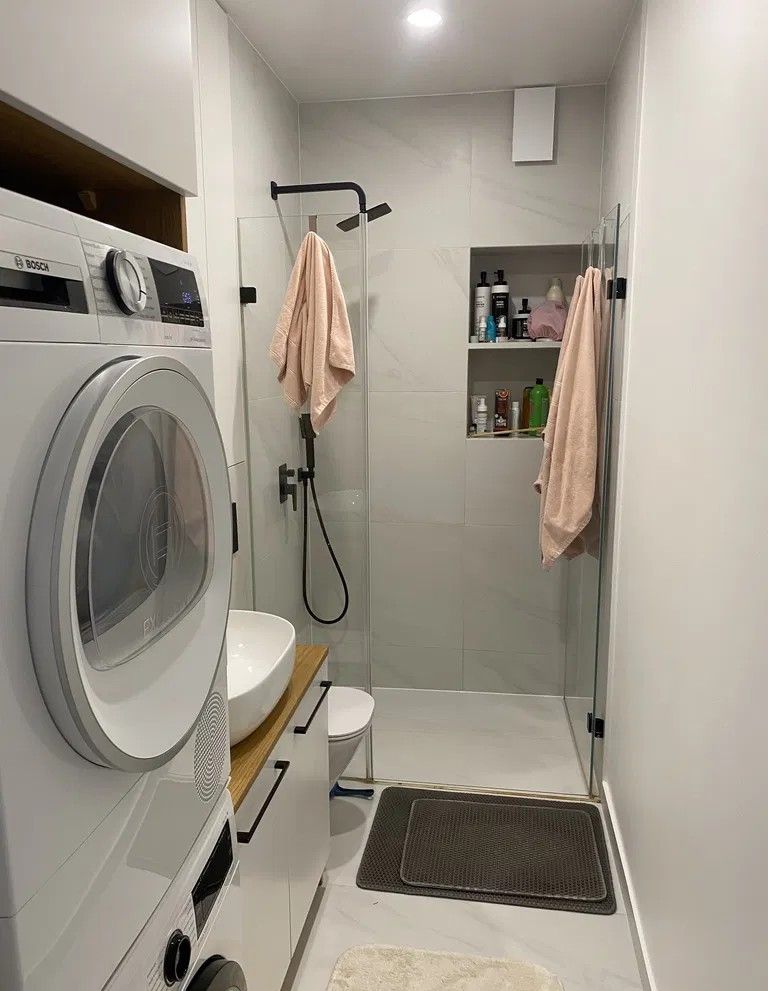 Łazienka (4,6 m²): Nowoczesna, z prysznicem (odpływ liniowy) oraz pralką i suszarką marki Bosch.