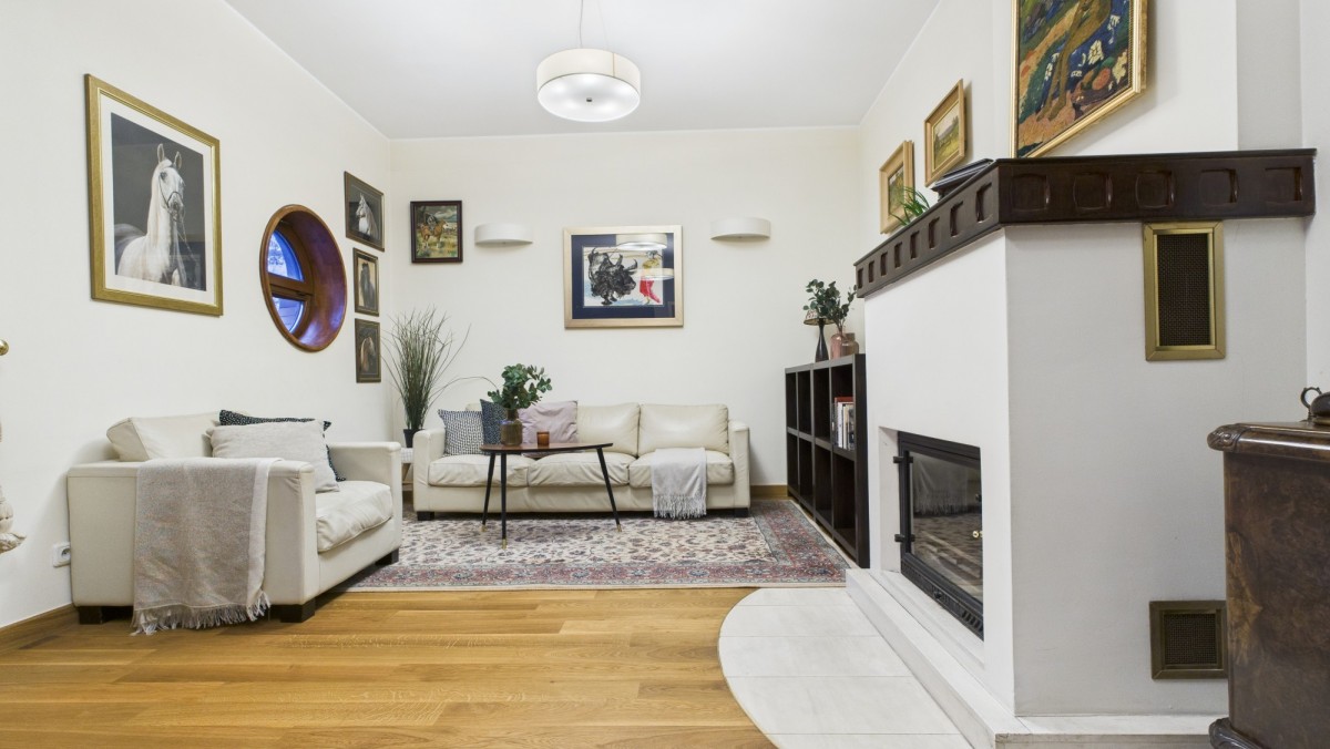 salon z kominkiem i wyjściem na loggię
