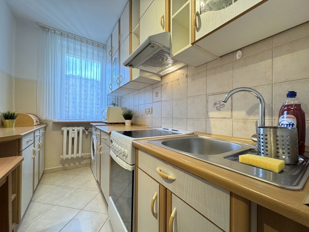 • oddzielna, widna kuchnia z oknem (5,33 m²), wyposażona w płytę elektryczną, piekarnik, okap z wyciągiem, lodówko-zamrażarkę i pralkę,